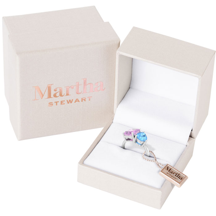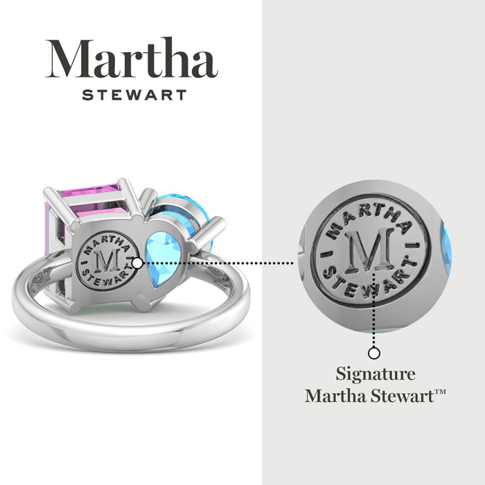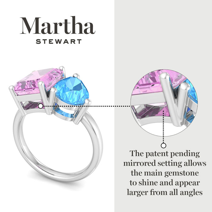 Showcasing class, style and timeless elegance, the Martha Stewart bridge jewelry collection is here to be celebrated. This collection features the finest gemstones and lab grown diamonds set in sterling silver. This Martha Stewart gemstone ring features one 10x8mm emerald cut synthetic pink sapphire gemstone weighing 3 carats and one 10x7mm pear shape simulated blue topaz gemstone weighing 1 3/4 carats. Total carat weight is approximately 4 3/4 carats. This ring is beautifully crafted in sterling silver, combining quality with timeless style. Featuring a comfort fit band, the Martha Stewart design ensures both secure and comfortable wear for any occasion. This ring showcases a patent-pending mirrored setting, designed to enhance the color and brilliance of the primary gemstone, making it even more captivating.
