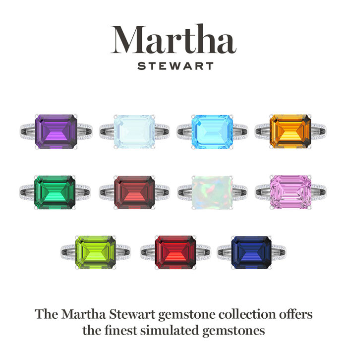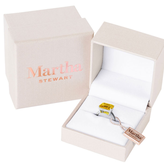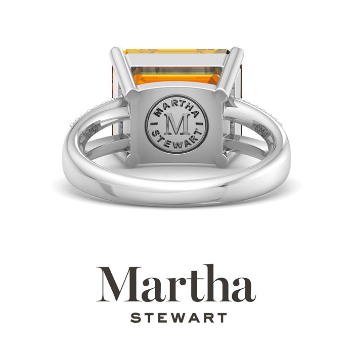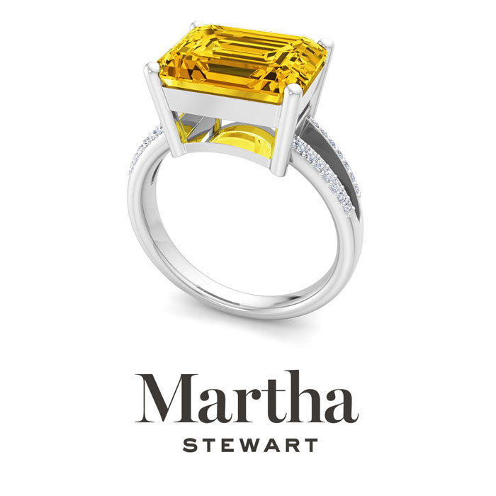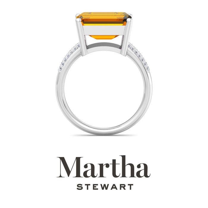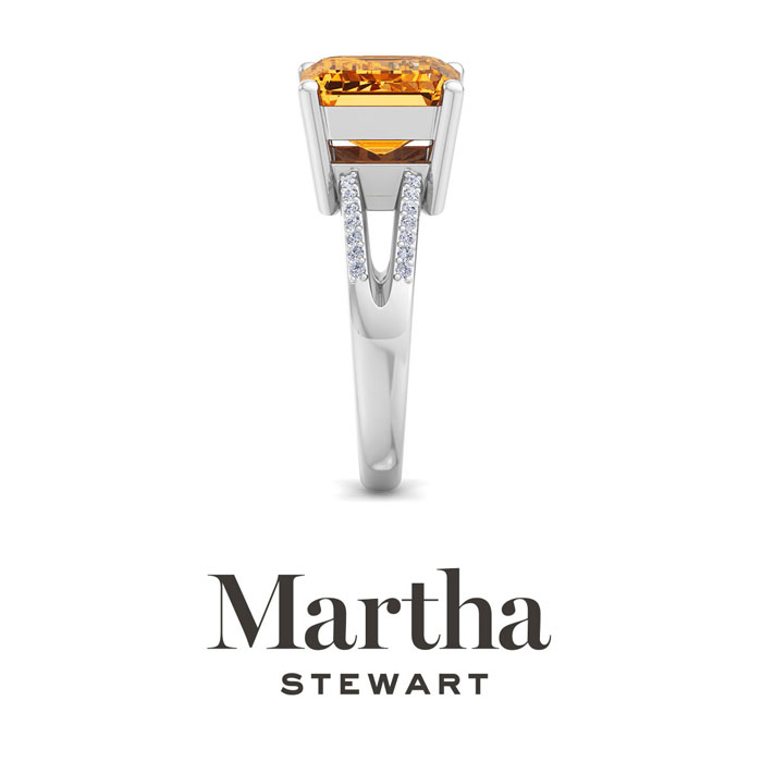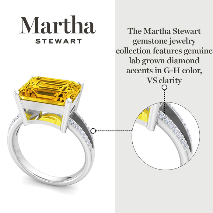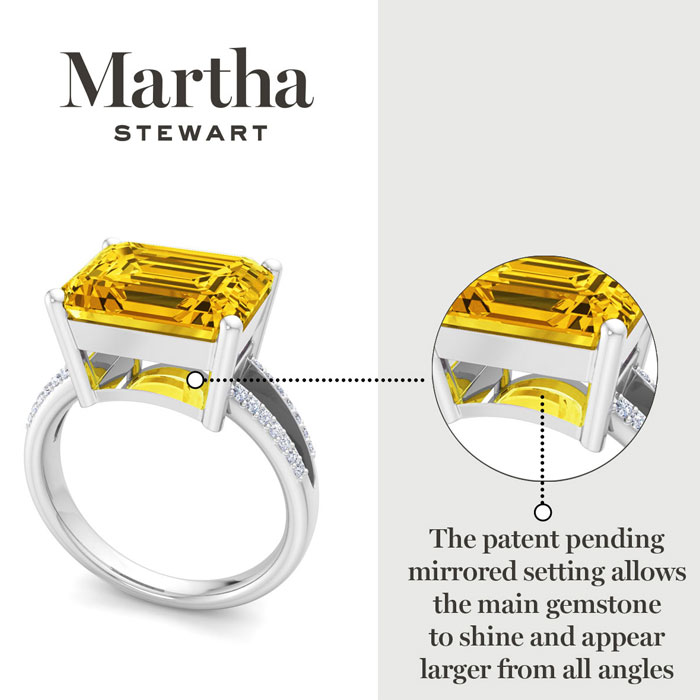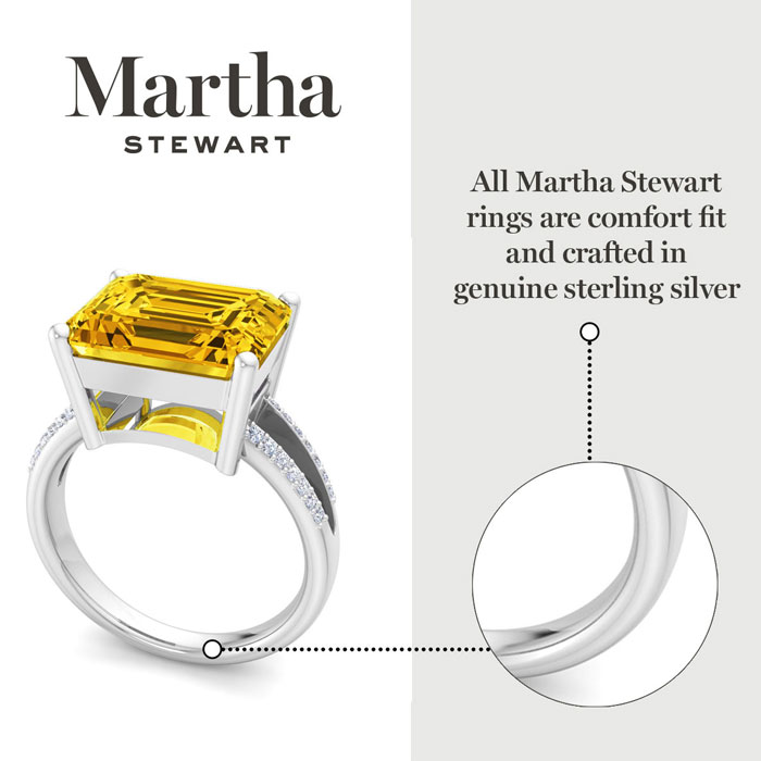 Showcasing class, style and timeless elegance, the Martha Stewart bridge jewelry collection is here to be celebrated. This collection features the finest gemstones and lab grown diamonds set in sterling silver. This Martha Stewart gemstone ring features one 12x10mm emerald cut simulated citrine gemstone weighing 5 1/2 carats. There are 28 lab grown diamonds in G-H color, VS clarity. Total carat weight is approximately 5.65 carats. This ring is beautifully crafted in sterling silver, combining quality with timeless style. Featuring a comfort fit band, the Martha Stewart design ensures both secure and comfortable wear for any occasion. This ring showcases a patent-pending mirrored setting, designed to enhance the color and brilliance of the primary gemstone, making it even more captivating.