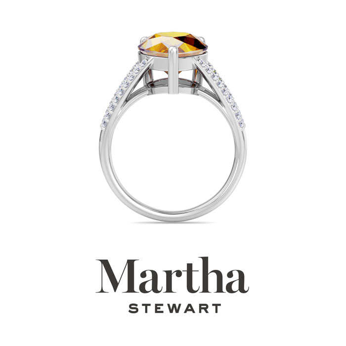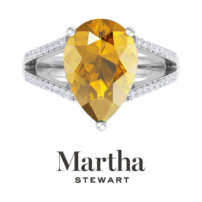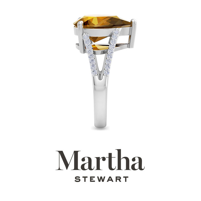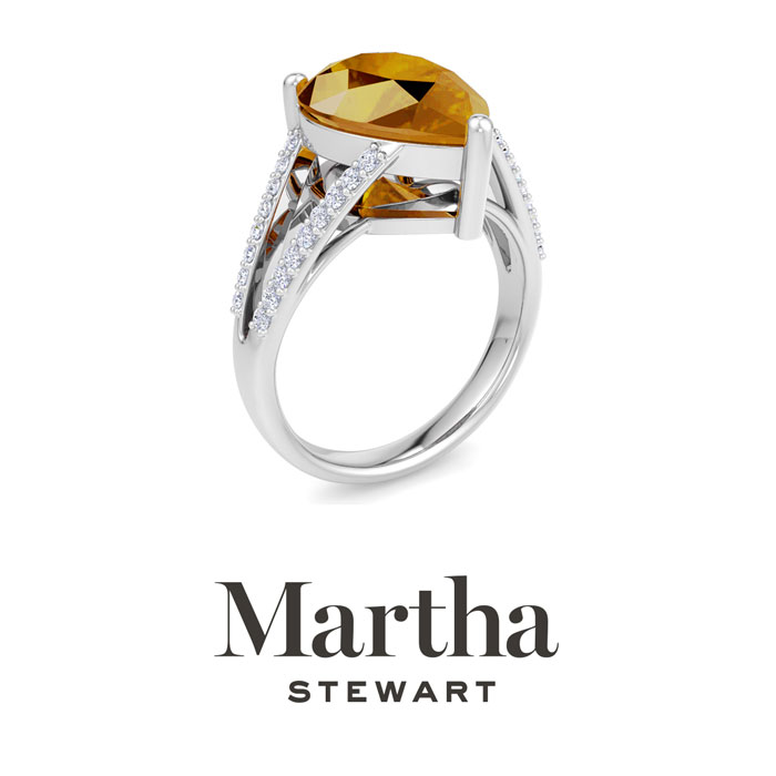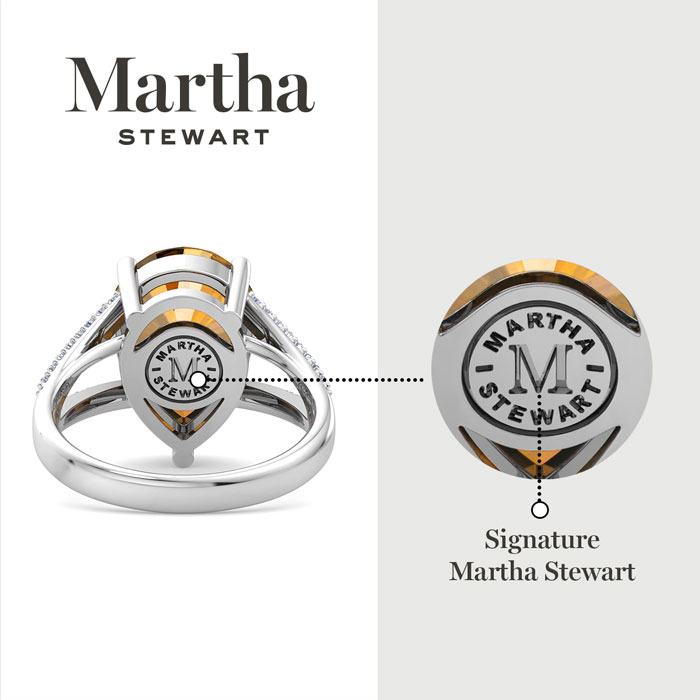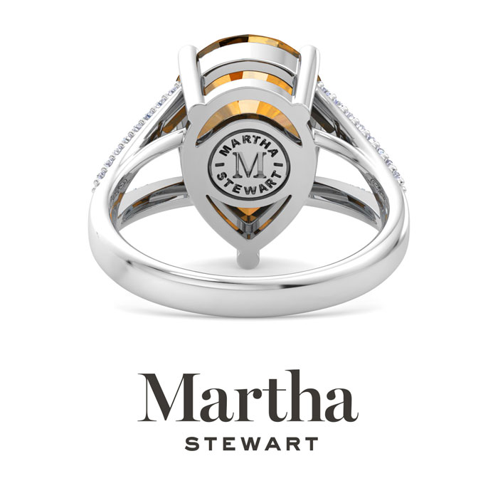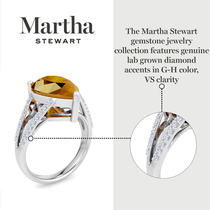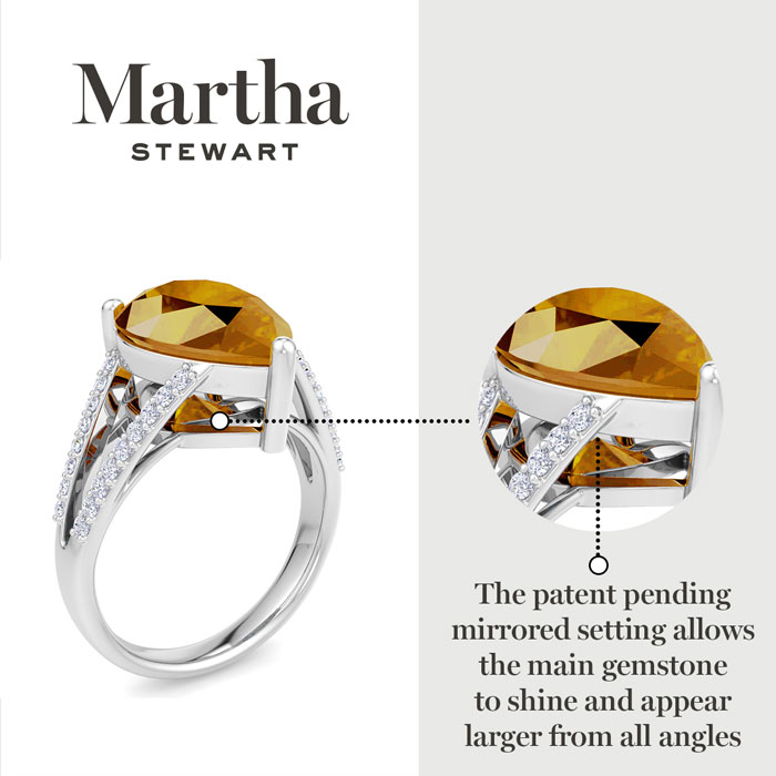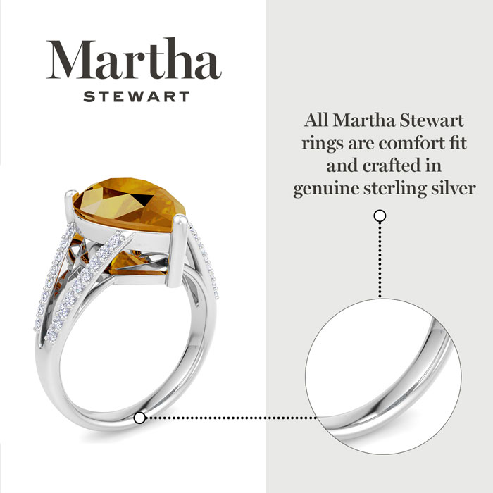 Showcasing class, style and timeless elegance, the Martha Stewart bridge jewelry collection is here to be celebrated. This collection features the finest gemstones and lab grown diamonds set in sterling silver. This Martha Stewart gemstone ring features one 14x10mm pear shape simulated citrine gemstone weighing 5 1/4 carats. There are 34 lab grown diamonds in G-H color, VS clarity. Total carat weight is approximately 5 1/2 carats. This ring is beautifully crafted in sterling silver, combining quality with timeless style. Featuring a comfort fit band, the Martha Stewart design ensures both secure and comfortable wear for any occasion. This ring showcases a patent-pending mirrored setting, designed to enhance the color and brilliance of the primary gemstone, making it even more captivating.