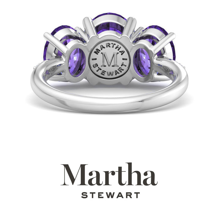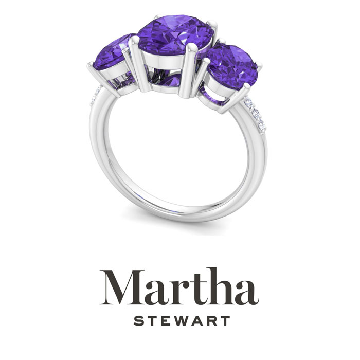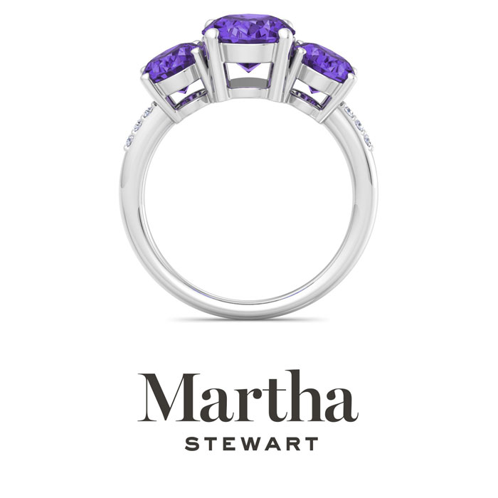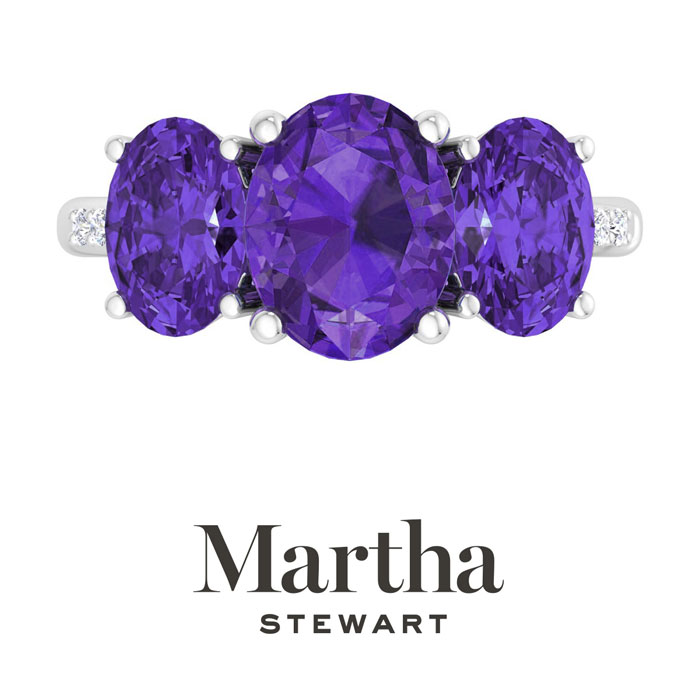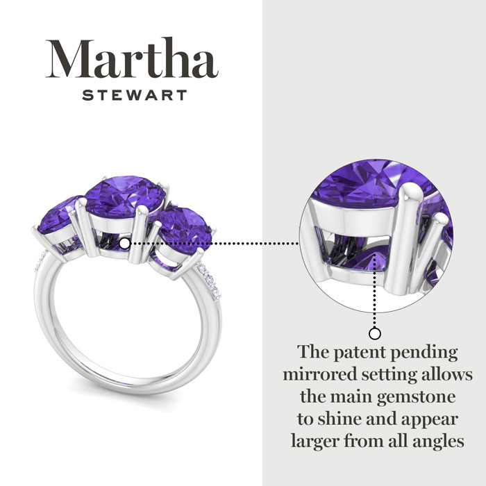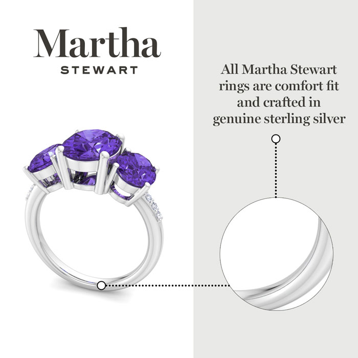 Showcasing class, style and timeless elegance, the Martha Stewart bridge jewelry collection is here to be celebrated. This collection features the finest gemstones and lab grown diamonds set in sterling silver. This Martha Stewart gemstone ring features one 10x8mm oval shape synthetic amethyst gemstone weighing 2 1/2 carats. There are two 8x6mm oval shape synthetic amethyst gemstones each weighing 1 1/4 carats. There are 6 lab grown diamonds in G-H color, VS clarity. Total carat weight is approximately 5 carats. This ring is beautifully crafted in sterling silver, combining quality with timeless style. Featuring a comfort fit band, the Martha Stewart design ensures both secure and comfortable wear for any occasion.This ring showcases a patent-pending mirrored setting, designed to enhance the color and brilliance of the primary gemstone, making it even more captivating.