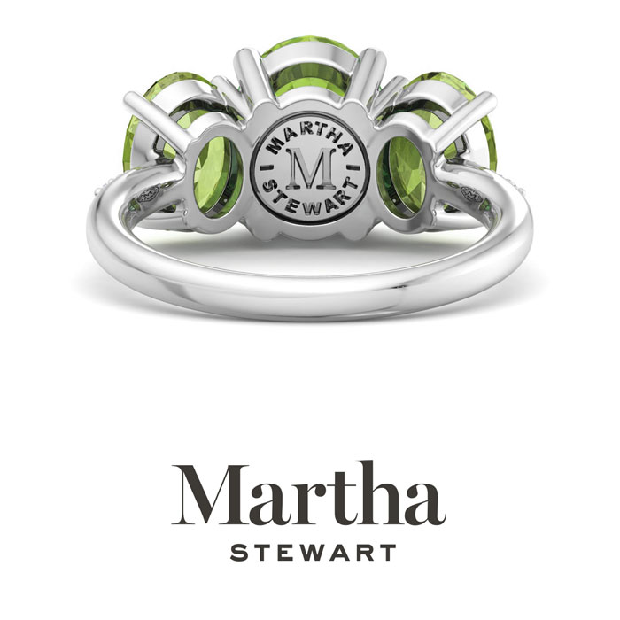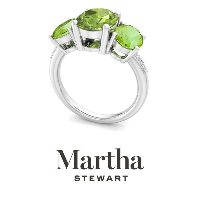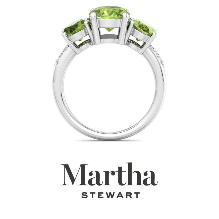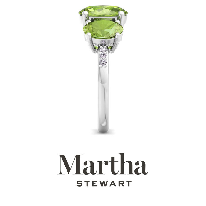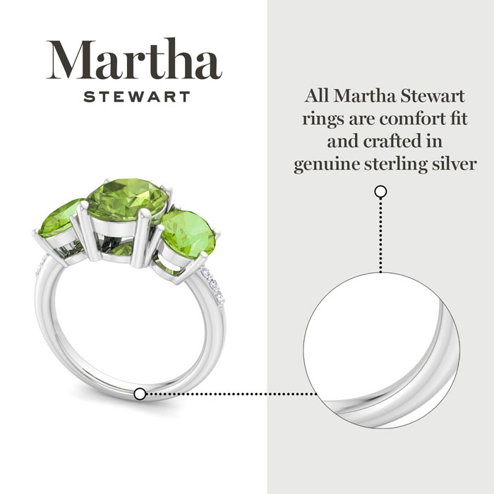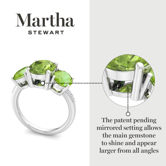 Showcasing class, style and timeless elegance, the Martha Stewart bridge jewelry collection is here to be celebrated. This collection features the finest gemstones and lab grown diamonds set in sterling silver. This Martha Stewart gemstone ring features one 10x8mm oval shape simulated peridot gemstone weighing 2 1/2 carats. There are two 8x6mm oval shape simulated peridot gemstones each weighing 1 1/4 carats. There are 6 lab grown diamonds in G-H color, VS clarity. Total carat weight is approximately 5 carats. This ring is beautifully crafted in sterling silver, combining quality with timeless style. Featuring a comfort fit band, the Martha Stewart design ensures both secure and comfortable wear for any occasion.This ring showcases a patent-pending mirrored setting, designed to enhance the color and brilliance of the primary gemstone, making it even more captivating.