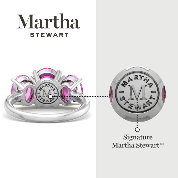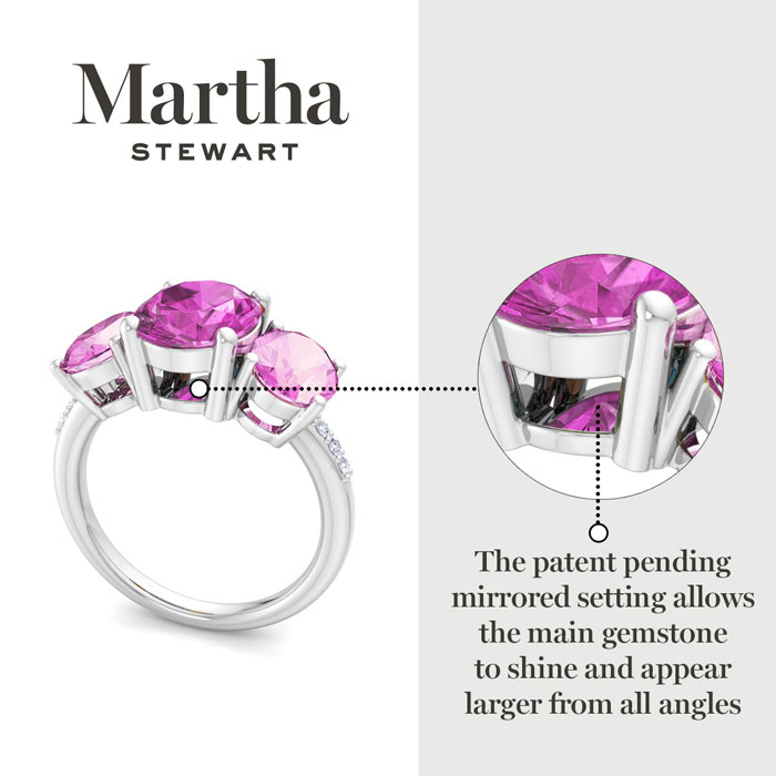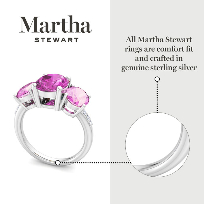 Showcasing class, style and timeless elegance, the Martha Stewart bridge jewelry collection is here to be celebrated. This collection features the finest gemstones and lab grown diamonds set in sterling silver. This Martha Stewart gemstone ring features one 10x8mm oval shape synthetic pink sapphire gemstone weighing 2 1/2 carats. There are two 8x6mm oval shape synthetic pink sapphire gemstones each weighing 1 1/4 carats. There are 6 lab grown diamonds in G-H color, VS clarity. Total carat weight is approximately 5 carats. This ring is beautifully crafted in sterling silver, combining quality with timeless style. Featuring a comfort fit band, the Martha Stewart design ensures both secure and comfortable wear for any occasion.This ring showcases a patent-pending mirrored setting, designed to enhance the color and brilliance of the primary gemstone, making it even more captivating.