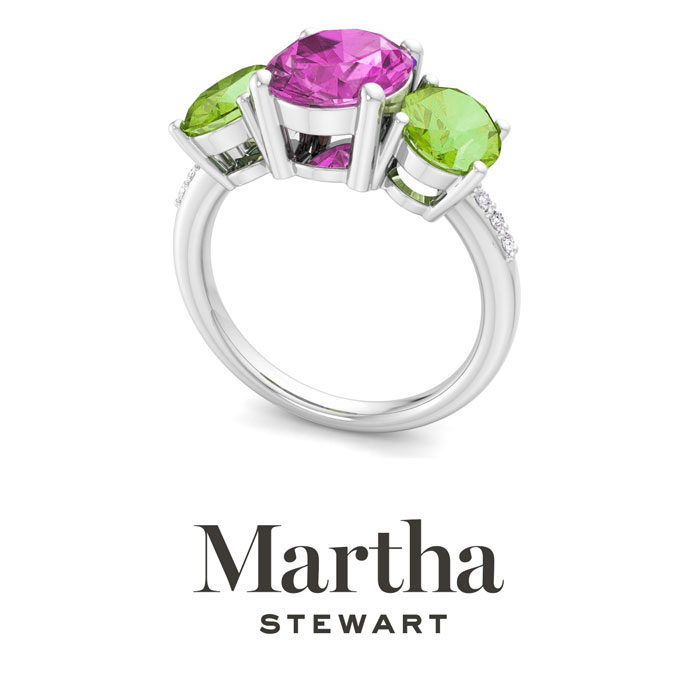 Showcasing class, style and timeless elegance, the Martha Stewart bridge jewelry collection is here to be celebrated. This collection features the finest gemstones and lab grown diamonds set in sterling silver. This Martha Stewart gemstone ring features one 10x8mm oval shape synthetic pink sapphire gemstone weighing 2 1/2 carats. There are two 8x6mm oval shape simulated peridot gemstones each weighing 1 1/4 carats. There are 6 lab grown diamonds in G-H color, VS clarity. Total carat weight is approximately 5 carats. This ring is beautifully crafted in sterling silver, combining quality with timeless style. Featuring a comfort fit band, the Martha Stewart design ensures both secure and comfortable wear for any occasion.This ring showcases a patent-pending mirrored setting, designed to enhance the color and brilliance of the primary gemstone, making it even more captivating.