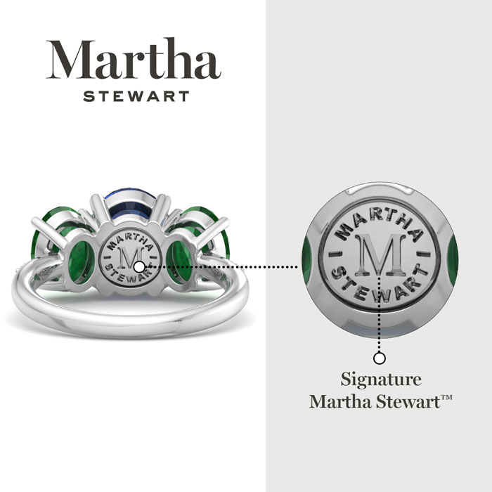 Showcasing class, style and timeless elegance, the Martha Stewart bridge jewelry collection is here to be celebrated. This collection features the finest gemstones and lab grown diamonds set in sterling silver. This Martha Stewart gemstone ring features one 10x8mm oval shape synthetic sapphire gemstone weighing 2 1/2 carats. There are two 8x6mm oval shape simulated emerald gemstones each weighing 1 1/4 carats. There are 6 lab grown diamonds in G-H color, VS clarity. Total carat weight is approximately 5 carats. This ring is beautifully crafted in sterling silver, combining quality with timeless style. Featuring a comfort fit band, the Martha Stewart design ensures both secure and comfortable wear for any occasion.This ring showcases a patent-pending mirrored setting, designed to enhance the color and brilliance of the primary gemstone, making it even more captivating.