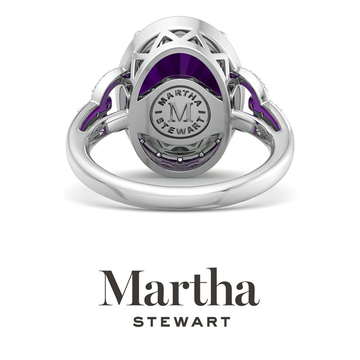 Showcasing class, style and timeless elegance, the Martha Stewart bridge jewelry collection is here to be celebrated. This collection features the finest gemstones and lab grown diamonds set in sterling silver. This Martha Stewart gemstone ring features one 14x10mm oval shape synthetic amethyst gemstone weighing 6 1/2 carats. There are 54 lab grown diamonds in G-H color, VS clarity. Total carat weight is approximately 6 3/4 carats. This ring is beautifully crafted in sterling silver, combining quality with timeless style. Featuring a comfort fit band, the Martha Stewart design ensures both secure and comfortable wear for any occasion. This ring showcases a patent-pending mirrored setting, designed to enhance the color and brilliance of the primary gemstone, making it even more captivating.