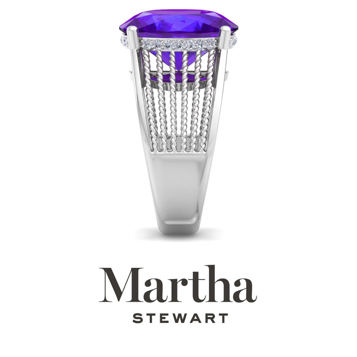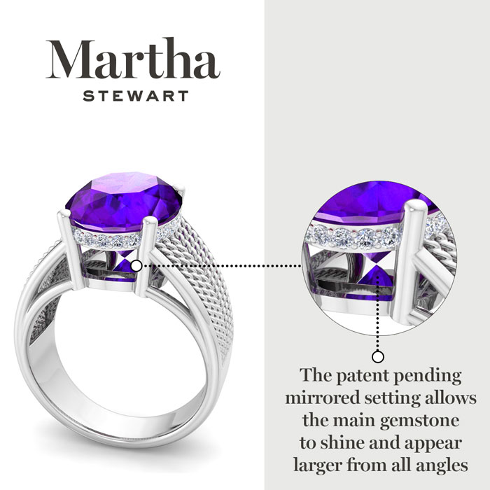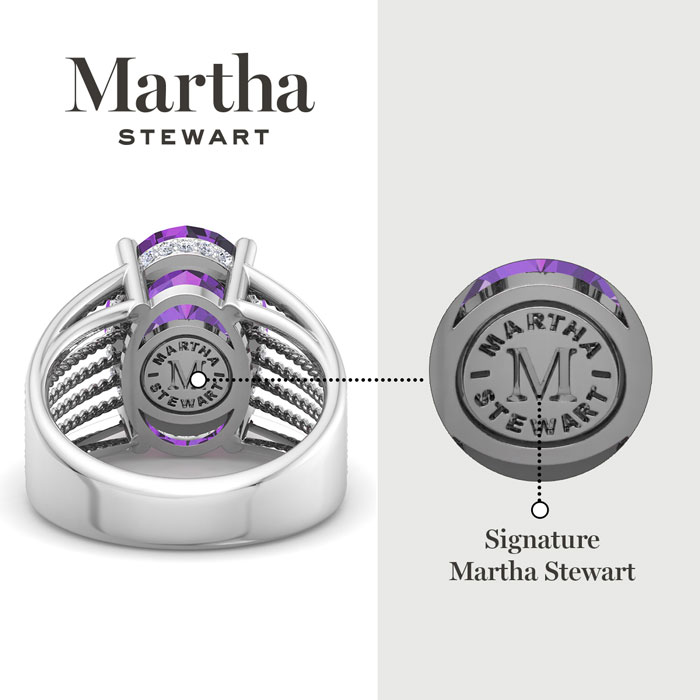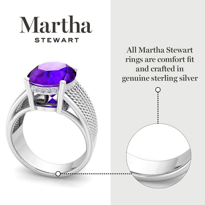 Showcasing class, style and timeless elegance, the Martha Stewart bridge jewelry collection is here to be celebrated. This collection features the finest gemstones and lab grown diamonds set in sterling silver. This Martha Stewart gemstone ring features one 14x10mm oval shape synthetic amethyst gemstone weighing 6 1/2 carats. There are 24 lab grown diamonds in G-H color, VS clarity. Total carat weight is approximately 6 3/4 carats. This ring is beautifully crafted in sterling silver, combining quality with timeless style. Featuring a comfort fit band, the Martha Stewart design ensures both secure and comfortable wear for any occasion. This ring showcases a patent-pending mirrored setting, designed to enhance the color and brilliance of the primary gemstone, making it even more captivating.
