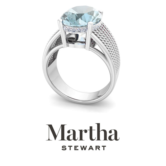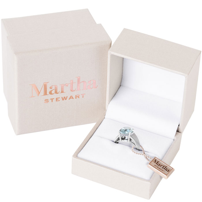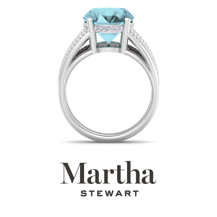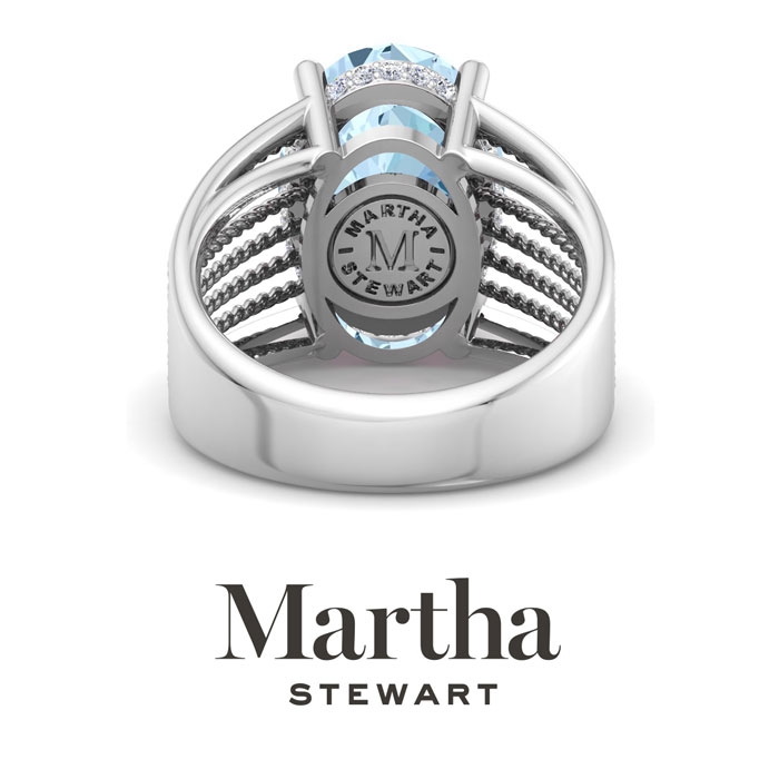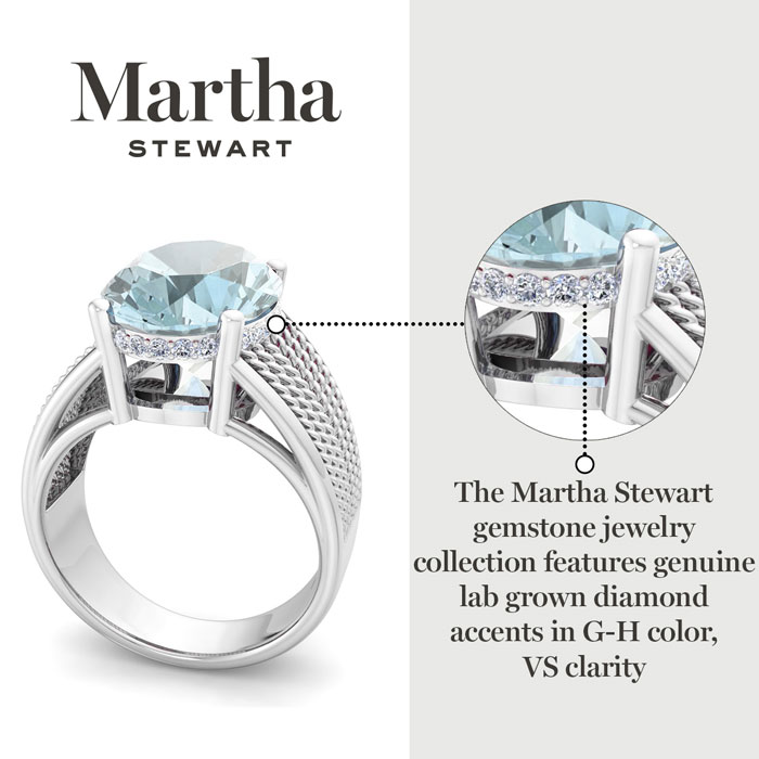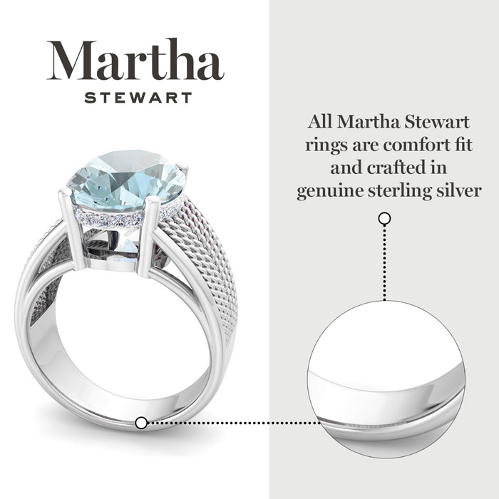 Showcasing class, style and timeless elegance, the Martha Stewart bridge jewelry collection is here to be celebrated. This collection features the finest gemstones and lab grown diamonds set in sterling silver. This Martha Stewart gemstone ring features one 14x10mm oval shape simulated aquamarine gemstone weighing 6 1/2 carats. There are 24 lab grown diamonds in G-H color, VS clarity. Total carat weight is approximately 6 3/4 carats. This ring is beautifully crafted in sterling silver, combining quality with timeless style. Featuring a comfort fit band, the Martha Stewart design ensures both secure and comfortable wear for any occasion. This ring showcases a patent-pending mirrored setting, designed to enhance the color and brilliance of the primary gemstone, making it even more captivating.