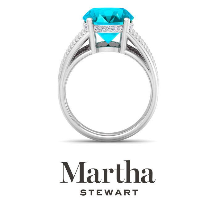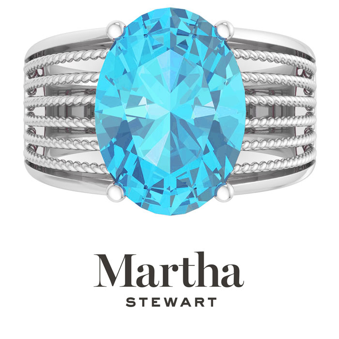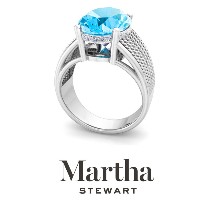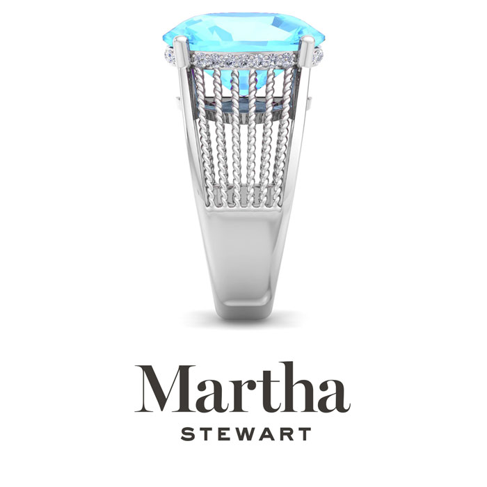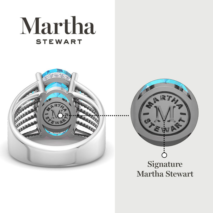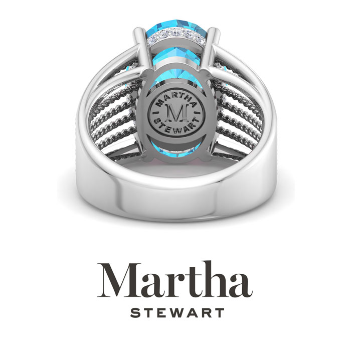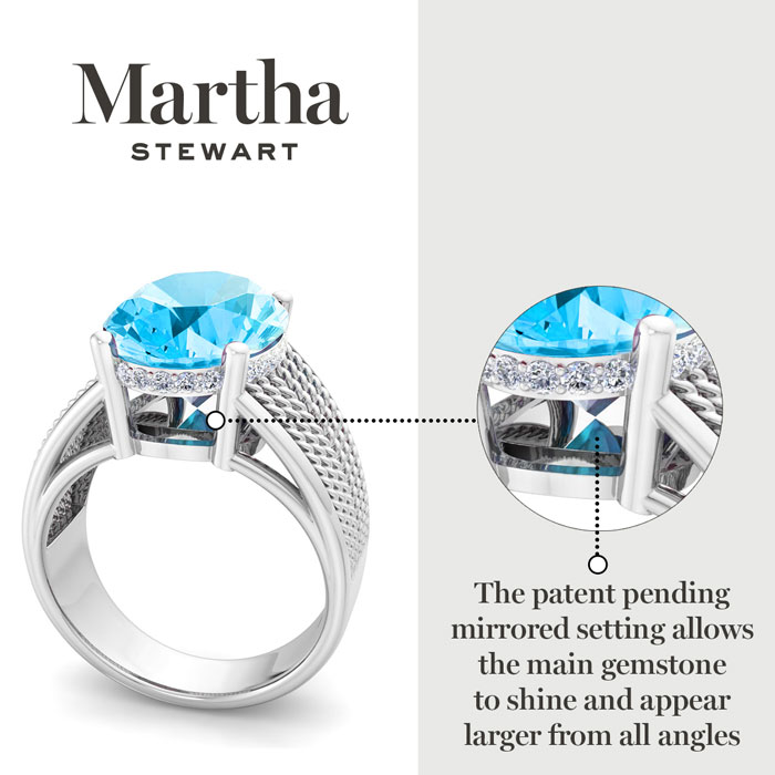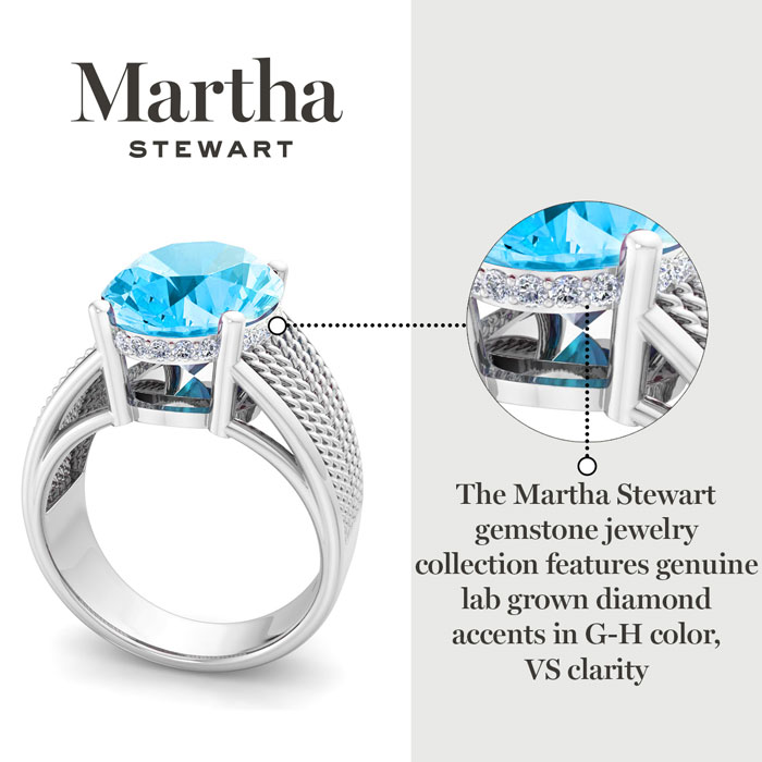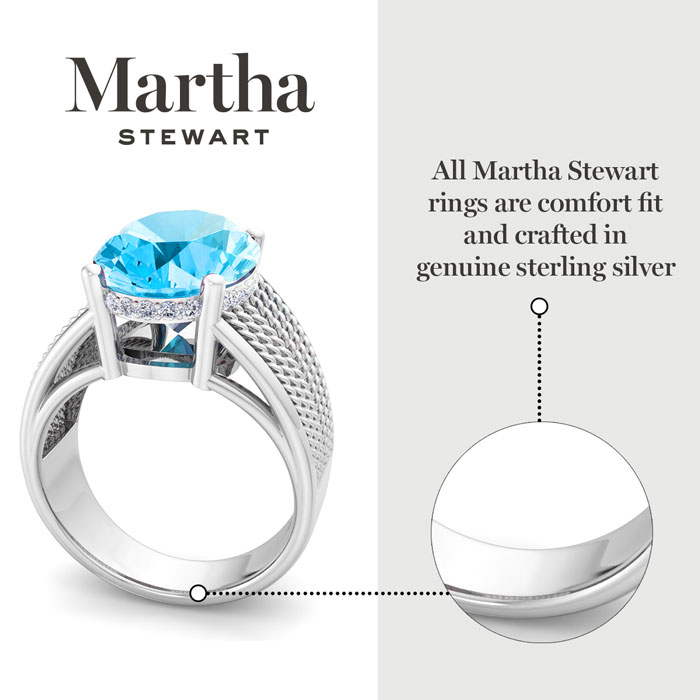Showcasing class, style and timeless elegance, the Martha Stewart bridge jewelry collection is here to be celebrated. This collection features the finest gemstones and lab grown diamonds set in sterling silver. This Martha Stewart gemstone ring features one 14x10mm oval shape simulated blue topaz gemstone weighing 6 1/2 carats. There are 24 lab grown diamonds in G-H color, VS clarity. Total carat weight is approximately 6 3/4 carats. This ring is beautifully crafted in sterling silver, combining quality with timeless style. Featuring a comfort fit band, the Martha Stewart design ensures both secure and comfortable wear for any occasion. This ring showcases a patent-pending mirrored setting, designed to enhance the color and brilliance of the primary gemstone, making it even more captivating.
