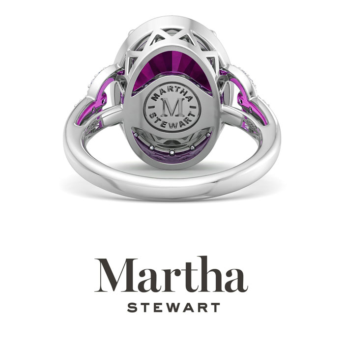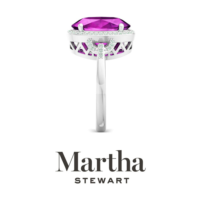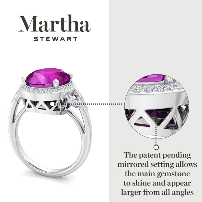 Showcasing class, style and timeless elegance, the Martha Stewart bridge jewelry collection is here to be celebrated. This collection features the finest gemstones and lab grown diamonds set in sterling silver. This Martha Stewart gemstone ring features one 14x10mm oval shape synthetic pink sapphire gemstone weighing 6 1/2 carats. There are 54 lab grown diamonds in G-H color, VS clarity. Total carat weight is approximately 6 3/4 carats. This ring is beautifully crafted in sterling silver, combining quality with timeless style. Featuring a comfort fit band, the Martha Stewart design ensures both secure and comfortable wear for any occasion. This ring showcases a patent-pending mirrored setting, designed to enhance the color and brilliance of the primary gemstone, making it even more captivating.