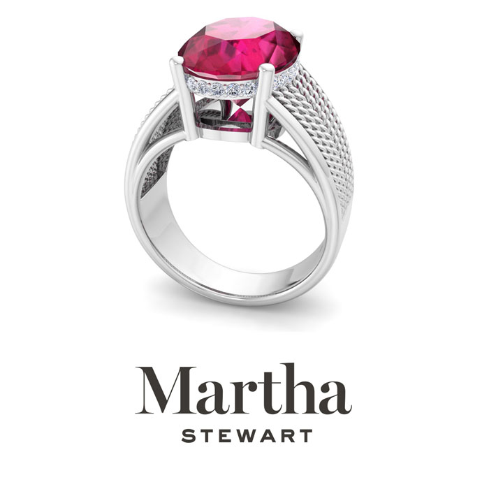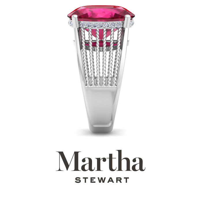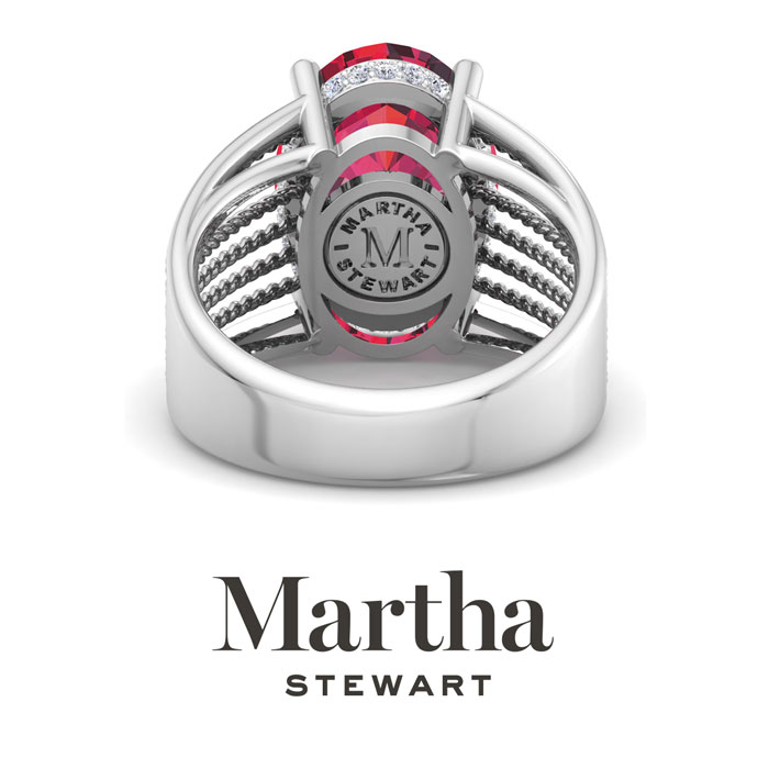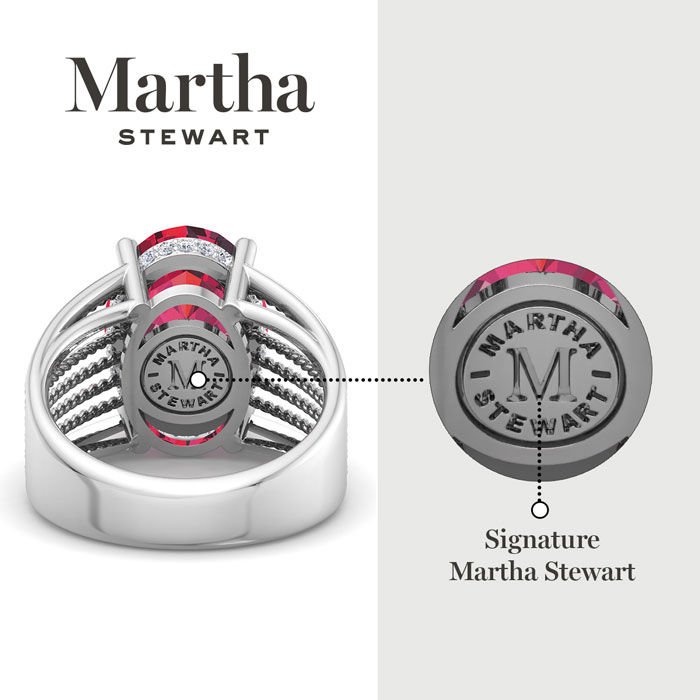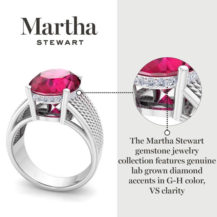 Showcasing class, style and timeless elegance, the Martha Stewart bridge jewelry collection is here to be celebrated. This collection features the finest gemstones and lab grown diamonds set in sterling silver. This Martha Stewart gemstone ring features one 14x10mm oval shape synthetic ruby gemstone weighing 6 1/2 carats. There are 24 lab grown diamonds in G-H color, VS clarity. Total carat weight is approximately 6 3/4 carats. This ring is beautifully crafted in sterling silver, combining quality with timeless style. Featuring a comfort fit band, the Martha Stewart design ensures both secure and comfortable wear for any occasion. This ring showcases a patent-pending mirrored setting, designed to enhance the color and brilliance of the primary gemstone, making it even more captivating.