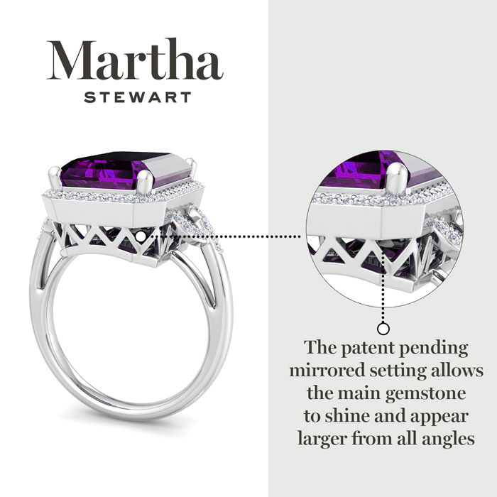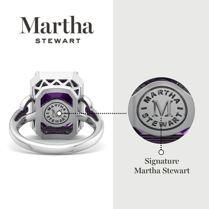 Showcasing class, style and timeless elegance, the Martha Stewart bridge jewelry collection is here to be celebrated. This collection features the finest gemstones and lab grown diamonds set in sterling silver. This Martha Stewart gemstone ring features one 14x10mm emerald cut synthetic amethyst gemstone weighing 7 carats. There are 60 lab grown diamonds in G-H color, VS clarity. Total carat weight is approximately 7 1/3 carats. This ring is beautifully crafted in sterling silver, combining quality with timeless style. Featuring a comfort fit band, the Martha Stewart design ensures both secure and comfortable wear for any occasion. This ring showcases a patent-pending mirrored setting, designed to enhance the color and brilliance of the primary gemstone, making it even more captivating.