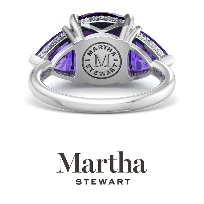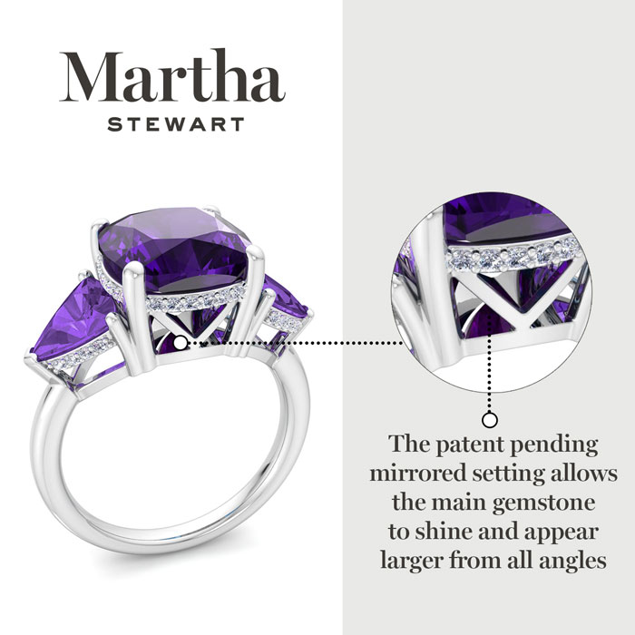 Showcasing class, style and timeless elegance, the Martha Stewart bridge jewelry collection is here to be celebrated. This collection features the finest gemstones and lab grown diamonds set in sterling silver. This Martha Stewart gemstone ring features one 10mm cushion cut synthetic amethyst gemstone weighing 6 carats. There are two 7mm trillion synthetic amethyst gemstones each weighing 1 carat. There are 40 lab grown diamonds in G-H color, VS clarity. Total carat weight is approximately 8 1/5 carats. This ring is beautifully crafted in sterling silver, combining quality with timeless style. Featuring a comfort fit band, the Martha Stewart design ensures both secure and comfortable wear for any occasion. This ring showcases a patent-pending mirrored setting, designed to enhance the color and brilliance of the primary gemstone, making it even more captivating.