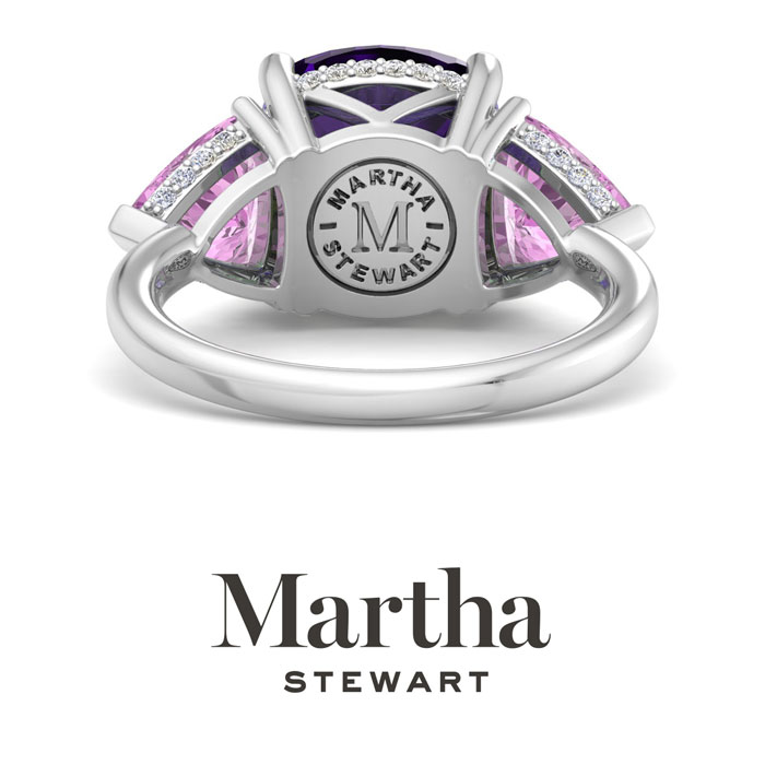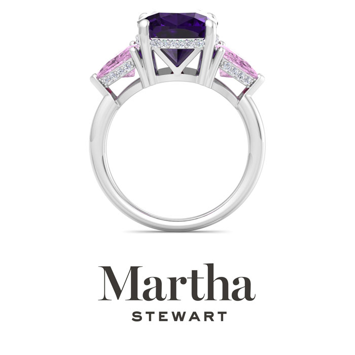 Showcasing class, style and timeless elegance, the Martha Stewart bridge jewelry collection is here to be celebrated. This collection features the finest gemstones and lab grown diamonds set in sterling silver. This Martha Stewart gemstone ring features one 10mm cushion cut synthetic amethyst gemstone weighing 6 carats. There are two 7mm trillion synthetic pink sapphire gemstones each weighing 1 carat. There are 40 lab grown diamonds in G-H color, VS clarity. Total carat weight is approximately 8 1/5 carats. This ring is beautifully crafted in sterling silver, combining quality with timeless style. Featuring a comfort fit band, the Martha Stewart design ensures both secure and comfortable wear for any occasion. This ring showcases a patent-pending mirrored setting, designed to enhance the color and brilliance of the primary gemstone, making it even more captivating.