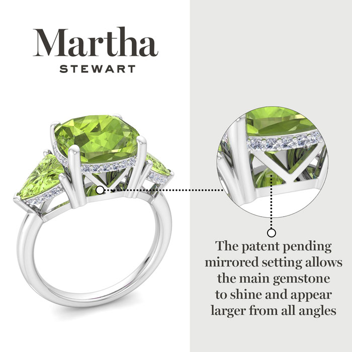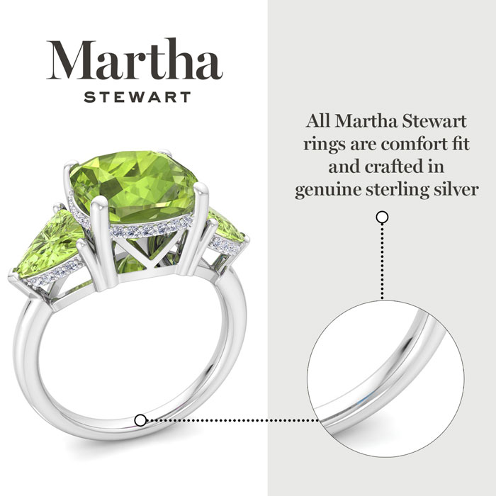 Showcasing class, style and timeless elegance, the Martha Stewart bridge jewelry collection is here to be celebrated. This collection features the finest gemstones and lab grown diamonds set in sterling silver. This Martha Stewart gemstone ring features one 10mm cushion cut simulated peridot gemstone weighing 6 carats. There are two 7mm trillion simulated peridot gemstones each weighing 1 carat. There are 40 lab grown diamonds in G-H color, VS clarity. Total carat weight is approximately 8 1/5 carats. This ring is beautifully crafted in sterling silver, combining quality with timeless style. Featuring a comfort fit band, the Martha Stewart design ensures both secure and comfortable wear for any occasion. This ring showcases a patent-pending mirrored setting, designed to enhance the color and brilliance of the primary gemstone, making it even more captivating.