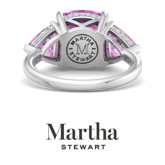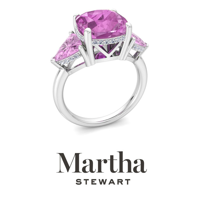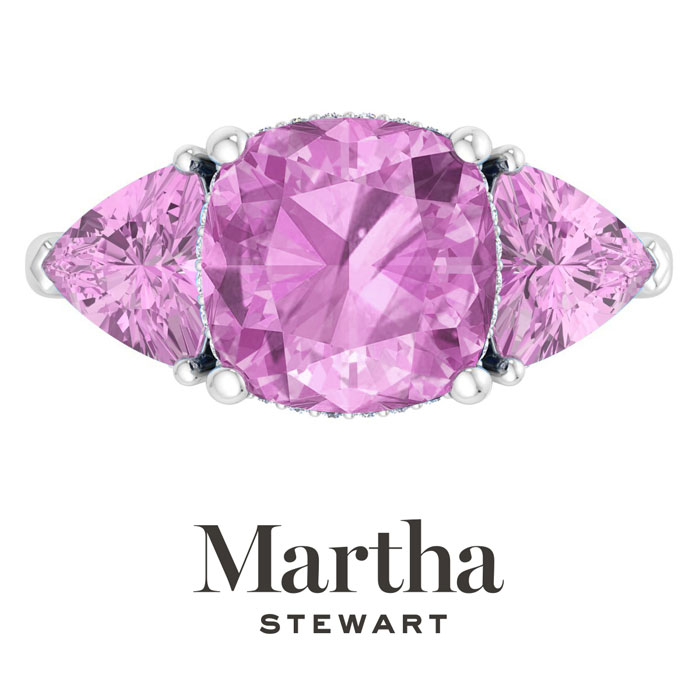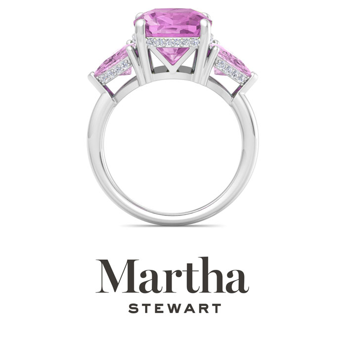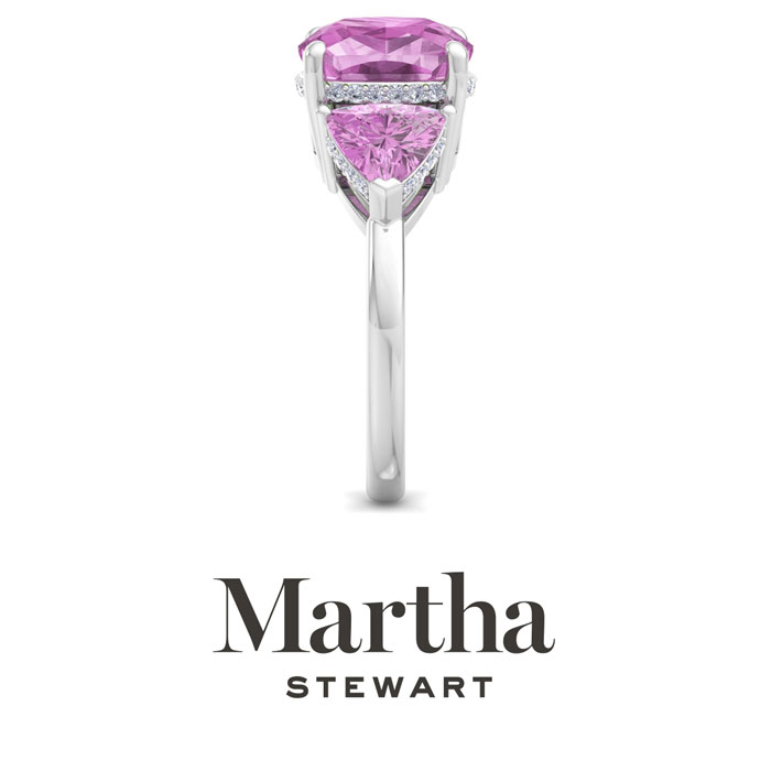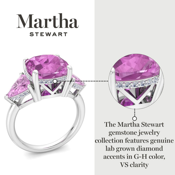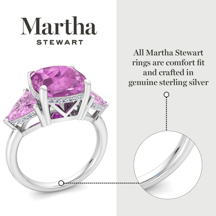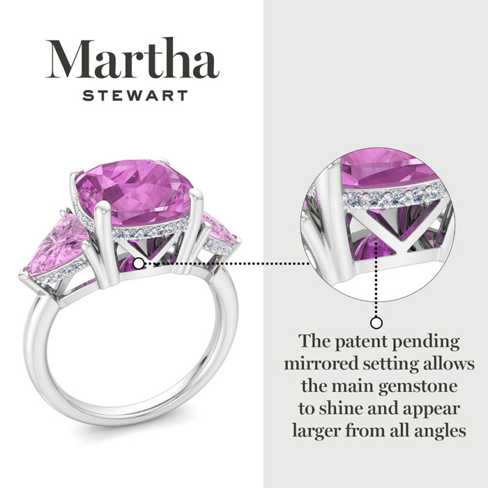Showcasing class, style and timeless elegance, the Martha Stewart bridge jewelry collection is here to be celebrated. This collection features the finest gemstones and lab grown diamonds set in sterling silver. This Martha Stewart gemstone ring features one 10mm cushion cut synthetic pink sapphire gemstone weighing 6 carats. There are two 7mm trillion synthetic pink sapphire gemstones each weighing 1 carat. There are 40 lab grown diamonds in G-H color, VS clarity. Total carat weight is approximately 8 1/5 carats. This ring is beautifully crafted in sterling silver, combining quality with timeless style. Featuring a comfort fit band, the Martha Stewart design ensures both secure and comfortable wear for any occasion. This ring showcases a patent-pending mirrored setting, designed to enhance the color and brilliance of the primary gemstone, making it even more captivating.