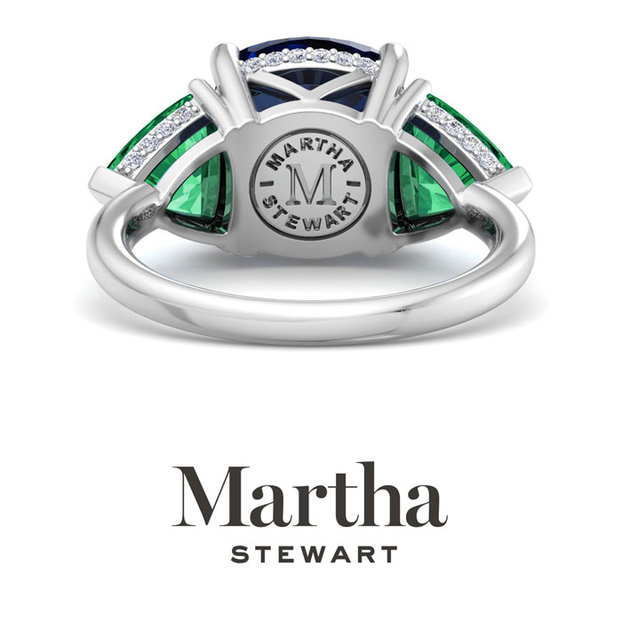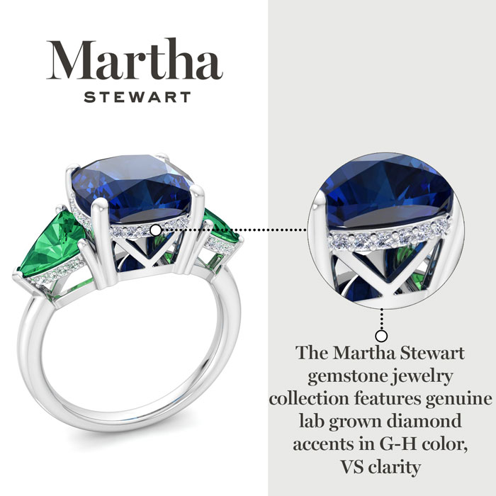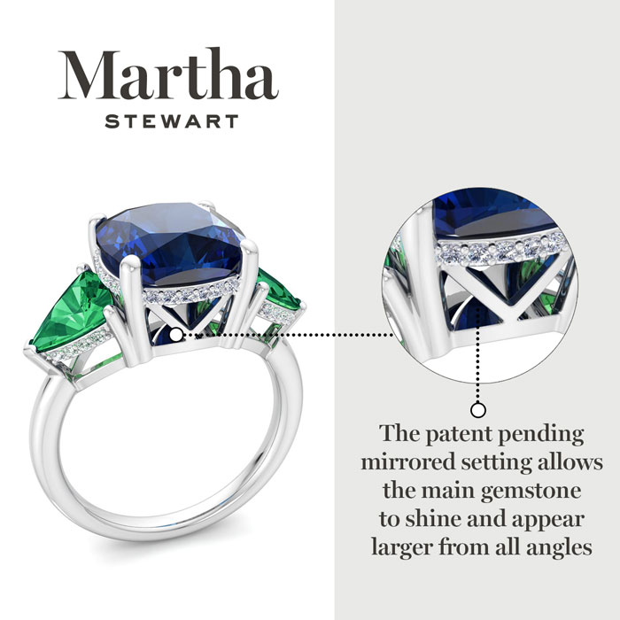 Showcasing class, style and timeless elegance, the Martha Stewart bridge jewelry collection is here to be celebrated. This collection features the finest gemstones and lab grown diamonds set in sterling silver. This Martha Stewart gemstone ring features one 10mm cushion cut synthetic sapphire gemstone weighing 6 carats. There are two 7mm trillion simulated emerald gemstones each weighing 1 carat. There are 40 lab grown diamonds in G-H color, VS clarity. Total carat weight is approximately 8 1/5 carats. This ring is beautifully crafted in sterling silver, combining quality with timeless style. Featuring a comfort fit band, the Martha Stewart design ensures both secure and comfortable wear for any occasion. This ring showcases a patent-pending mirrored setting, designed to enhance the color and brilliance of the primary gemstone, making it even more captivating.