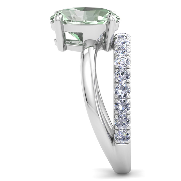This elegant gemstone ring features one 10x8mm oval shape green amethyst gemstone at approximately 2 1/3 carats. It is surrounded by 18 sparkling diamonds in I-J color, I1-I2 clarity at 1/2 carat total weight. Total gem weight is approximately 2 3/4 carats. This ring is in 14 karat white gold.