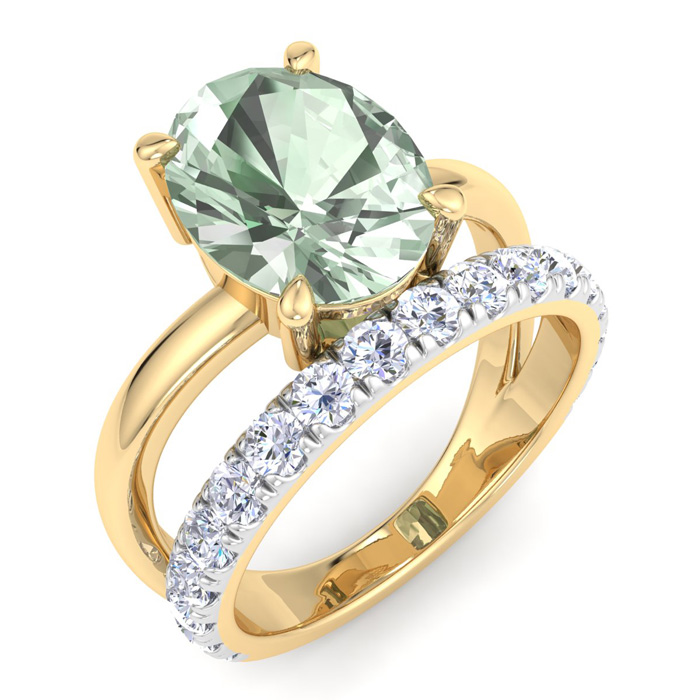 2 3/4 Carat Oval Shape Green Amethyst and Halo Diamond Ring Plus Band In 14 Karat Yellow Gold