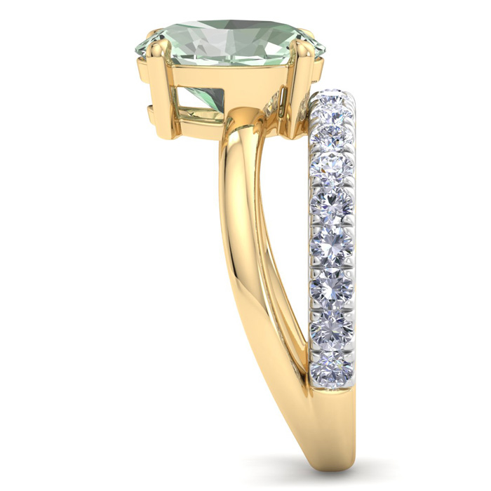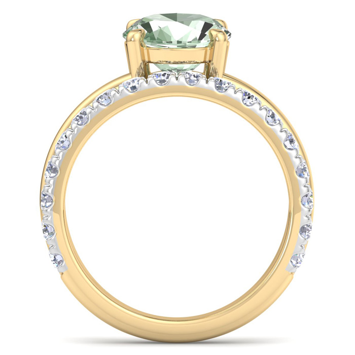 This elegant gemstone ring features one 10x8mm oval shape green amethyst gemstone at approximately 2 1/3 carats. It is surrounded by 18 sparkling diamonds in I-J color, I1-I2 clarity at 1/2 carat total weight. Total gem weight is approximately 2 3/4 carats. This ring is in 14 karat yellow gold.