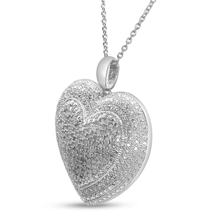 This incredible diamond heart necklace features 108 natural sparkling diamonds in H-I color, SI2-I1 clarity. Total carat weight is approximately 2 carats. This necklace is in sterling silver and comes with an 18 inch cable chain with a spring ring clasp. The pendant is 1 1/2 inches long.