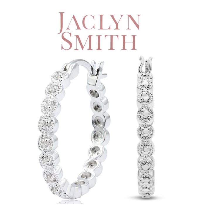 Perfectly balancing luxury and affordability, the Jaclyn Smith moissanite jewelry collection offers refined, versatile pieces that elevate any wardrobe with understated glamour. These moissanite hoop earrings feature 16 sparkling moissanites in E-F color, VVS1-VVS2 clarity at 1/4 carat total weight. The hoops have secure hinge with notched posts. These earrings are in platinum over brass metal and are 3/4 inch in diameter.