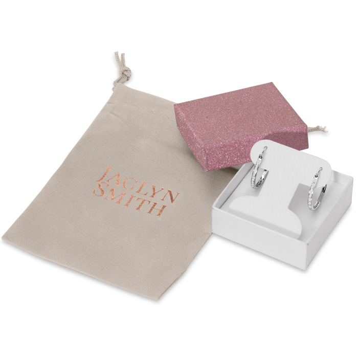 Perfectly balancing luxury and affordability, the Jaclyn Smith moissanite jewelry collection offers refined, versatile pieces that elevate any wardrobe with understated glamour. These hoop earrings are a classic! These earrings feature 50 sparkling moissanites for a total weight of 1/4 carat. Moissanite color is E-F, moissanite clarity is VVS1-VVS2. These are are crafted in platinum overlay and have secure, hinge with notched posts. These earrings dangle down 1 inch.