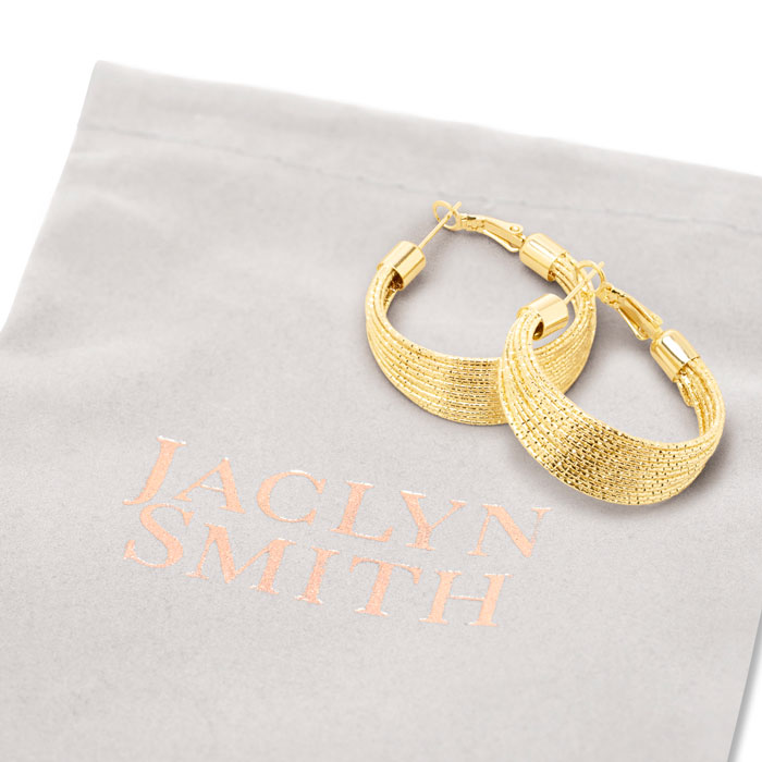 Perfectly balancing luxury and affordability, the Jaclyn Smith fashion jewelry collection offers refined, versatile pieces that elevate any wardrobe with understated glamour. These Jaclyn Smith Luminescent Hoop Earrings In Gold are 1 inch in diameter and have secure hinge with notched posts. These earrings are in yellow gold over brass metal.