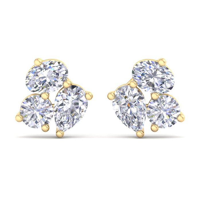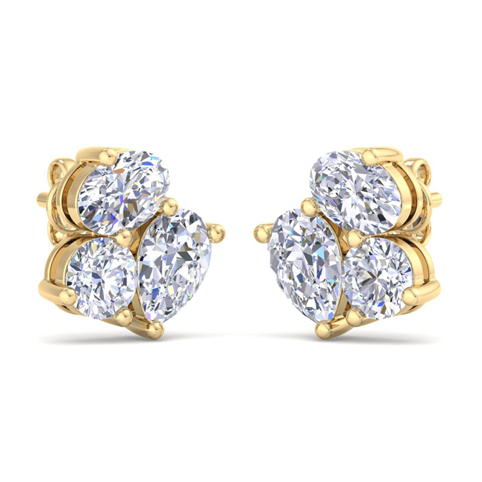These lab grown diamond earrings feature two round, oval and pear shape lab grown diamonds in G-H color, VS clarity. Total carat weight is 1 1/2 carats. These earrings are in 14 karat yellow gold. These earrings are approximately 1/2 inch in diameter have post with friction backs.