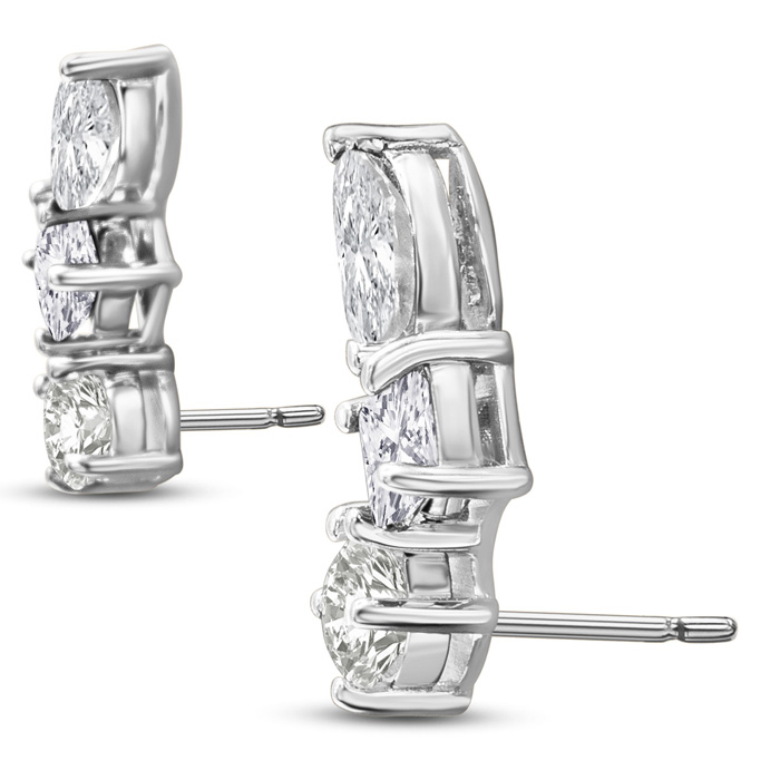 These lab grown diamond ear climbers feature two round, princess and marquise lab grown diamonds in G-H color, VS clarity. Total carat weight is 1 1/3 carats. These earrings are in 14 karat white gold. These earrings lay up the ear just over 1/2 inch and have post with friction backs.