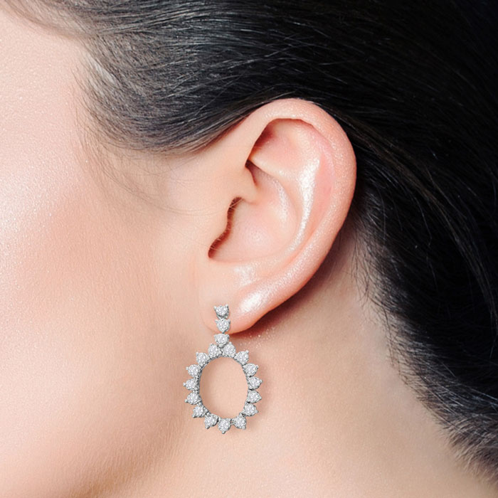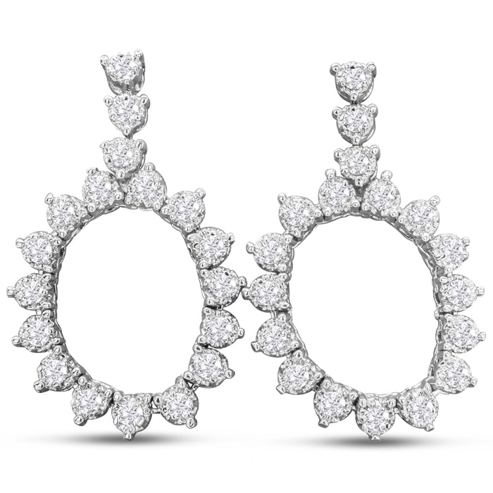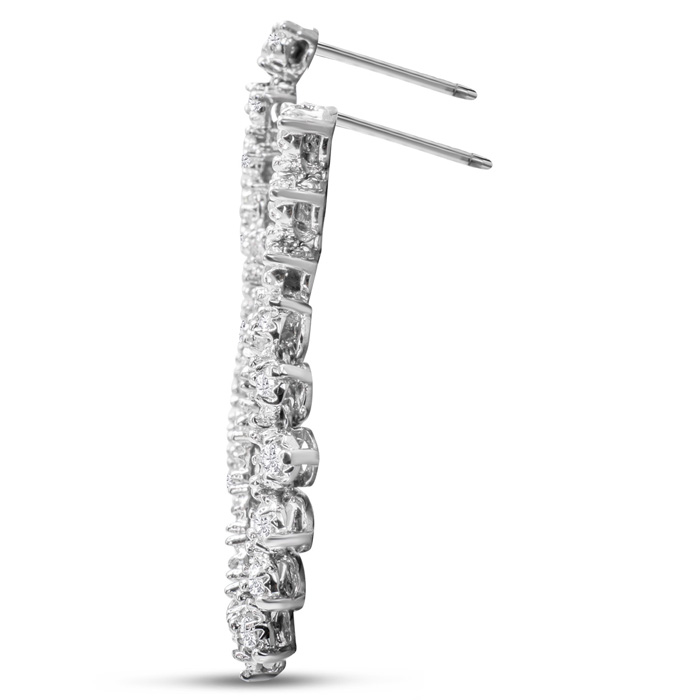 These lab grown diamond earrings feature 36 lab grown diamonds in G-H color, VS clarity. Total carat weight is 1 3/4 carats. These earrings are in 14 karat white gold. These earrings dangle down 1 1/4 inches and have post with friction backs. These earrings are flexible.