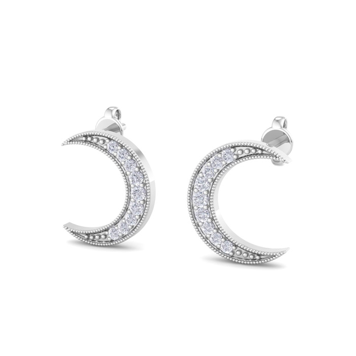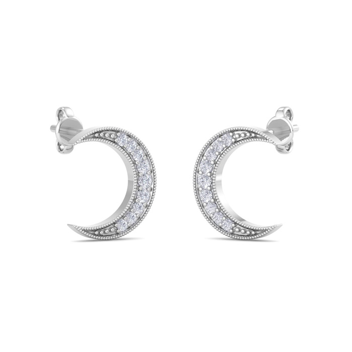 These diamond earrings feature 18 sparkling lab grown diamonds adorning moons. Total carat weight is 1/5 carat. Diamond color is G-H, diamond clarity is VS. These earrings are in sterling silver and have comfortable and secure post with friction backs.