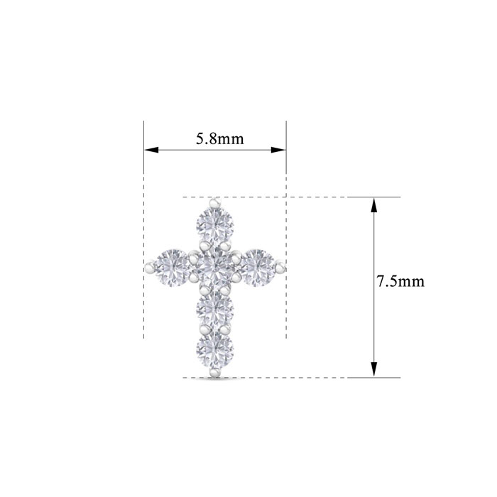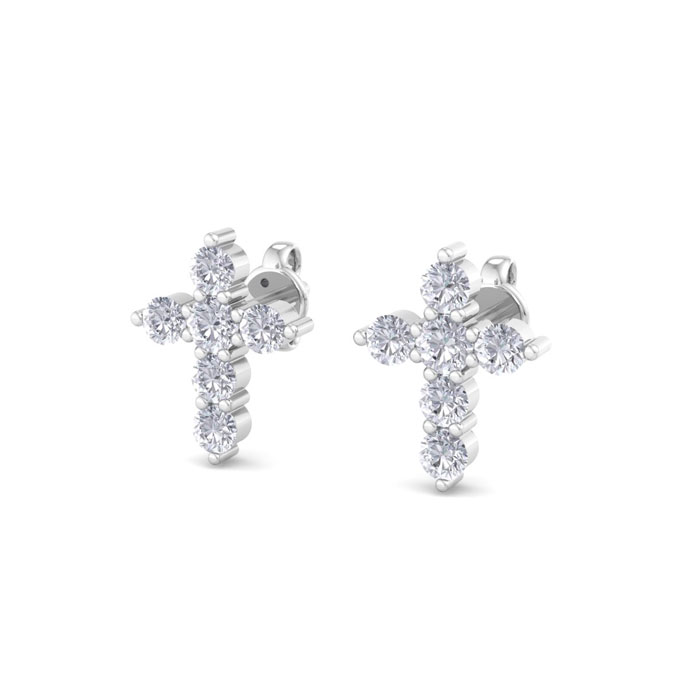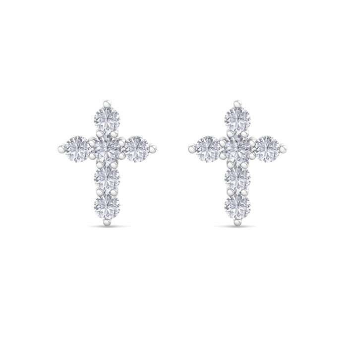 These diamond earrings feature 12 sparkling lab grown diamonds along a cross. Total carat weight is 1/5 carat. Diamond color is G-H, diamond clarity is VS. These earrings are in sterling silver and have comfortable and secure post with friction backs.