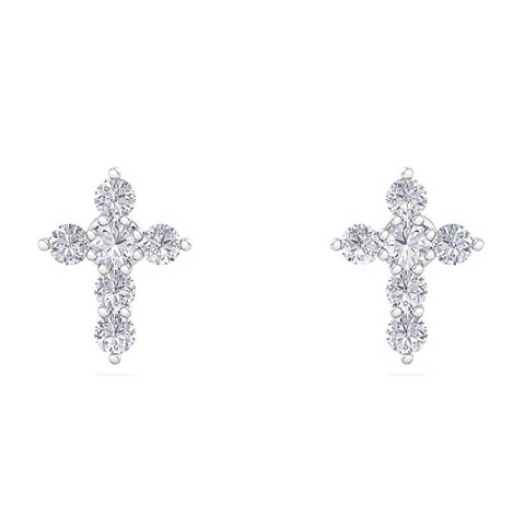 These diamond earrings feature 12 sparkling lab grown diamonds along a cross. Total carat weight is 1/5 carat. Diamond color is G-H, diamond clarity is VS. These earrings are in sterling silver and have comfortable and secure post with friction backs.