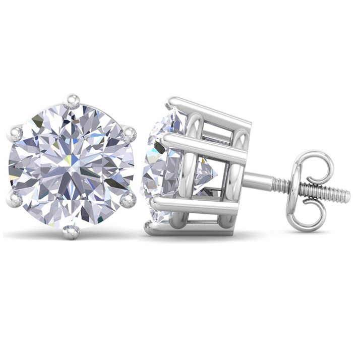 These lab grown diamond earrings feature two 5 carat lab grown diamonds in G-H color, VS clarity. Total carat weight is 10 carats. These earrings are in 14 karat white gold and are in a 6-prong setting with screwbacks.