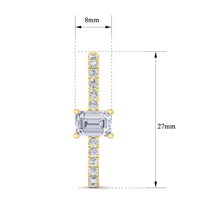 These lab grown diamond earrings feature 2 emerald cut and 24 round shape lab grown diamonds in G-H color, VS clarity. Total carat weight is 2 1/2 carats. These earrings are in 14 karat yellow gold. These earrings dangle down 1 Inch and have post with friction backs.