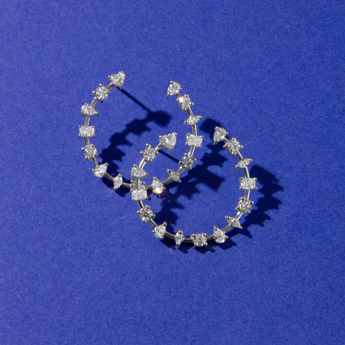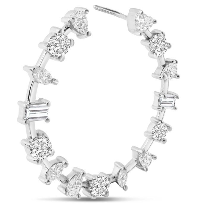 These lab grown diamond earrings feature 8 pear shape, 2 heart, 4 emerald cut, 6 marquise and 10 round lab grown diamonds in G-H color, VS clarity. Total carat weight is approximately 2 1/2 carats. These earrings are in 14 karat white gold and have post with friction backs. Hoops are 1 inch in diameter.