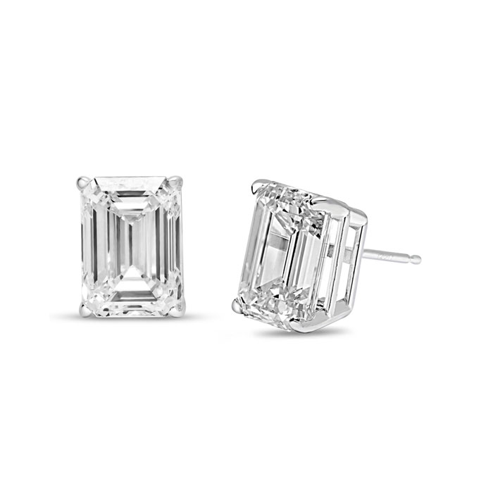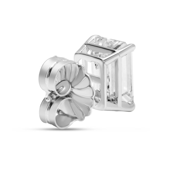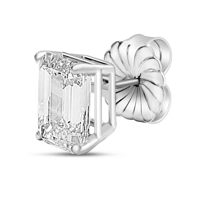 These lab grown diamond earrings feature two 1 carat emerald cut lab grown diamonds in G-H color, VS clarity. Total carat weight is 2 carats. These earrings are in 14 karat white gold and have secure screwbacks.