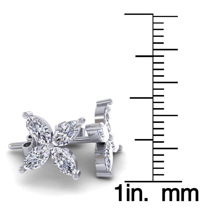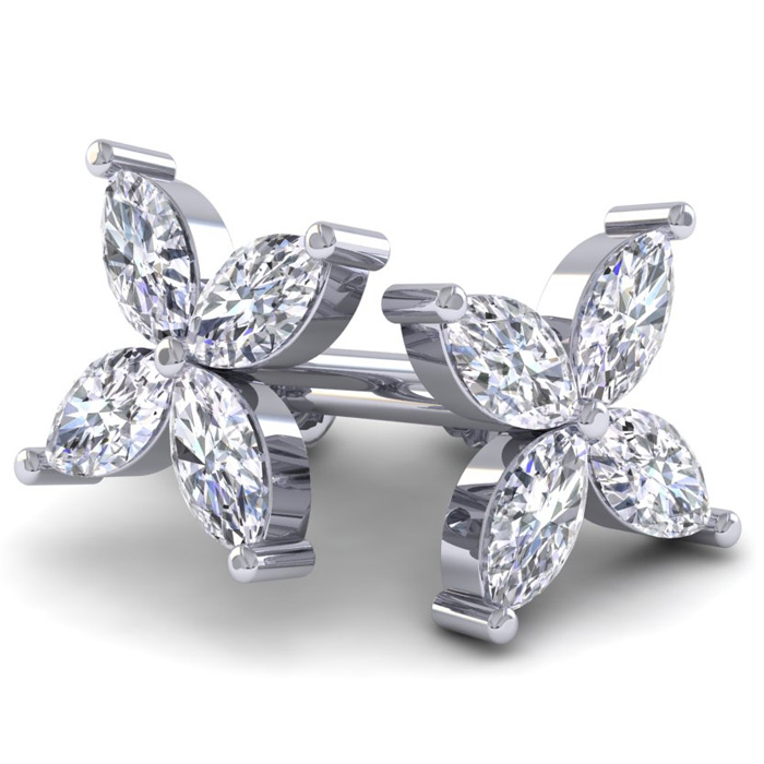 These lab grown diamond earrings feature eight 1/4 carat marquise shape lab grown diamonds in G-H color, VS clarity. Total carat weight is 2 carats. These earrings are in 14 karat white gold. These earrings have comfortable post with friction backs and measure 1/2 inch.