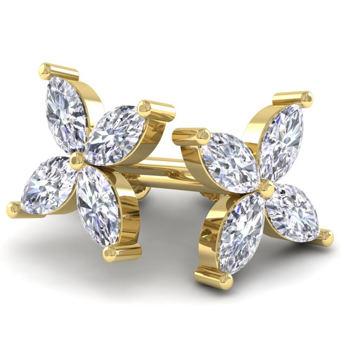 These lab grown diamond earrings feature eight 1/4 carat marquise shape lab grown diamonds in G-H color, VS clarity. Total carat weight is 2 carats. These earrings are in 14 karat yellow gold. These earrings have comfortable post with friction backs and measure 1/2 inch.