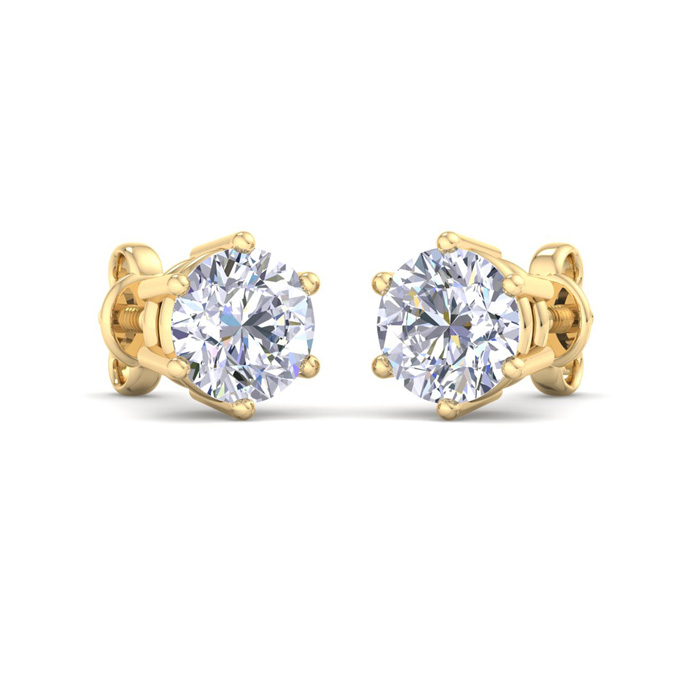 These lab grown diamond earrings feature two 1 carat lab grown diamonds in G-H color, VS clarity. Total carat weight is 2 carats. These earrings are in 14 karat yellow gold and are in a 6-prong setting with screwbacks.