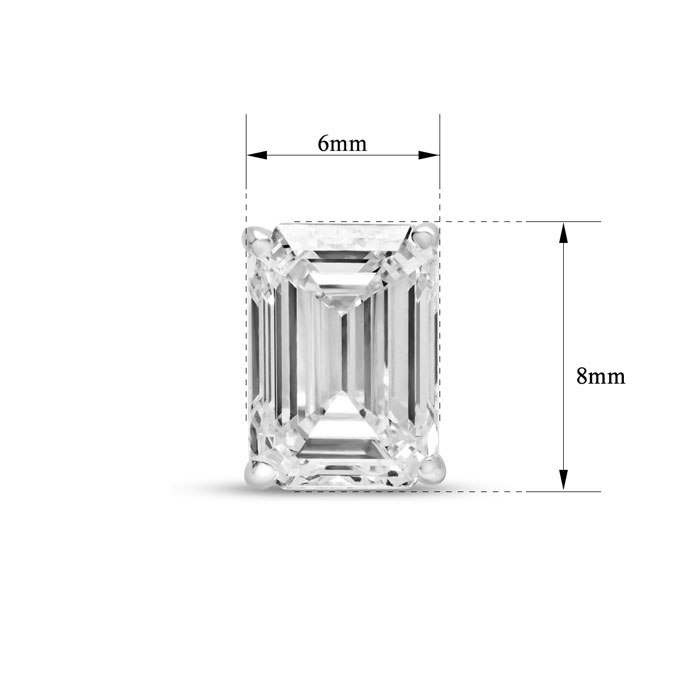 These lab grown diamond earrings feature two 2 carat emerald cut lab grown diamonds in G-H color, VS clarity. Total carat weight is 4 carats. These earrings are in 14 karat white gold and have secure screwbacks.