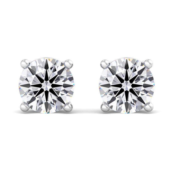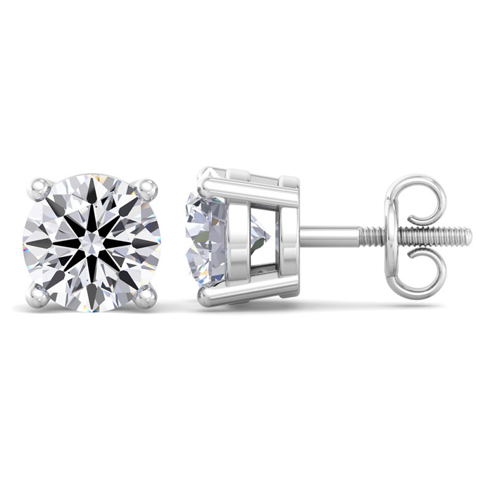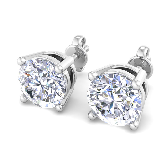 These lab grown diamond earrings feature two 2 carat lab grown diamonds in G-H color, VS clarity. Total carat weight is 4 carats. These earrings are in 14 karat white gold and are in a basket setting with screwbacks.