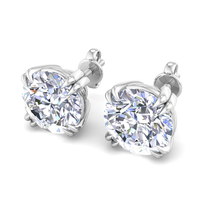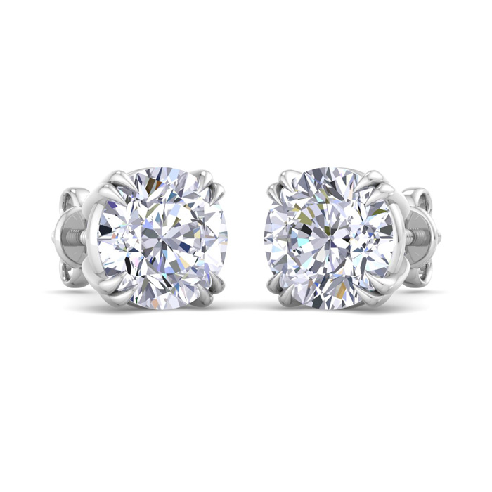 These lab grown diamond earrings feature two 2 carat lab grown diamonds in G-H color, VS clarity. Total carat weight is 4 carats. These earrings are in 14 karat white gold and are in a double prong setting with screwbacks.