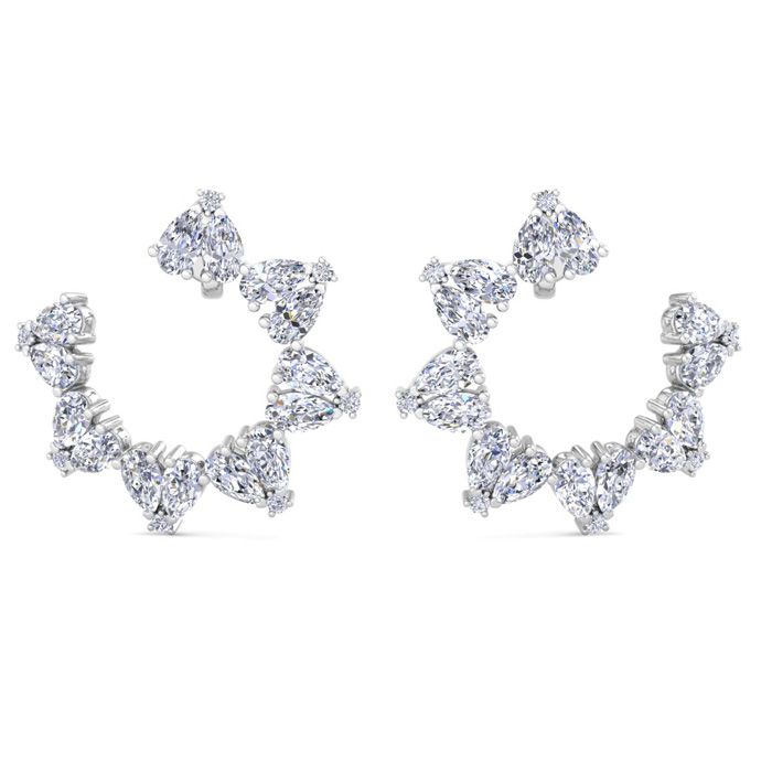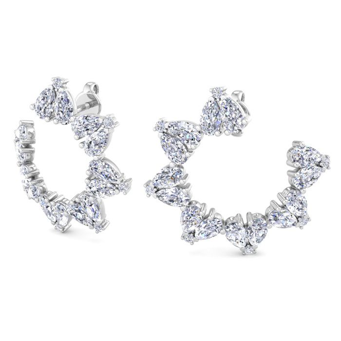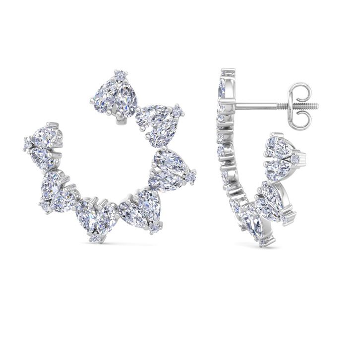 These lab grown diamond earrings feature 14 round and 28 pear shape lab grown diamonds in G-H color, VS clarity. Total carat weight is 5 3/4 carats. These earrings are in 14 karat white gold. These earrings dangle down 3/4 Inch and have post with friction backs.