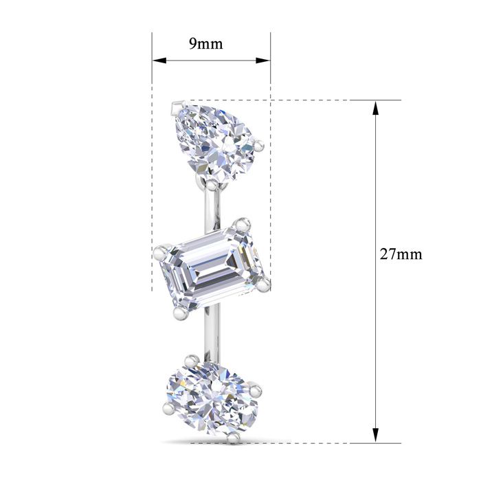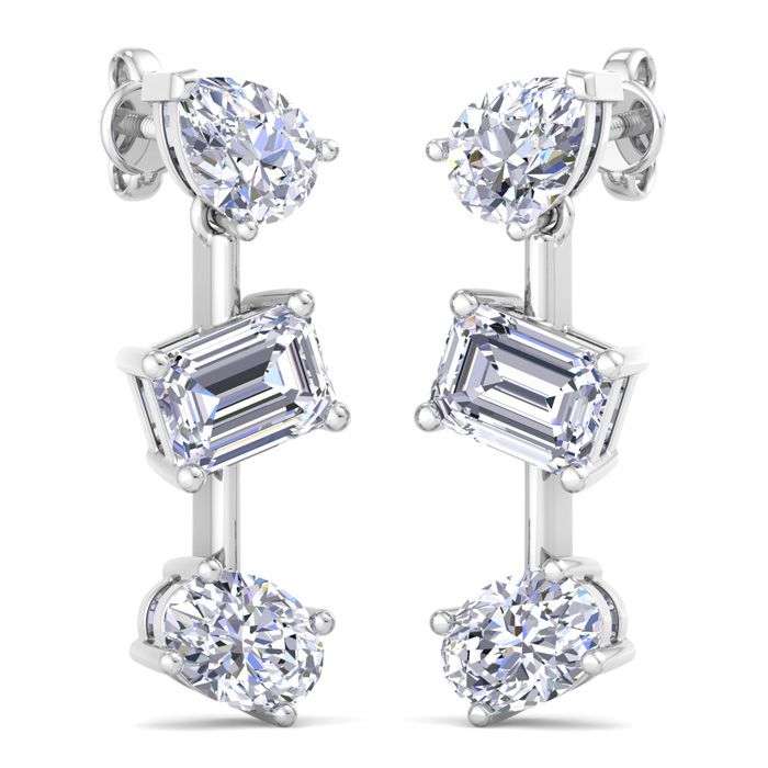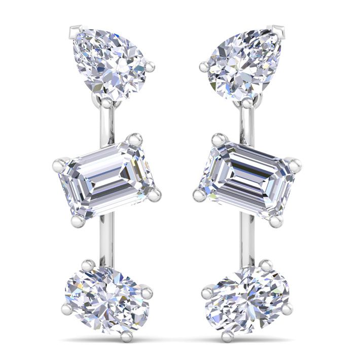 These lab grown diamond earrings feature 2 emerald cut, 2 oval shape and 2 pear shape lab grown diamonds in G-H color, VS clarity. Total carat weight is 5 carats. These earrings are in 14 karat white gold. These earrings dangle down 1 Inch and have post with friction backs.