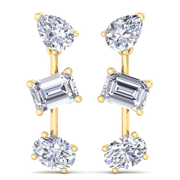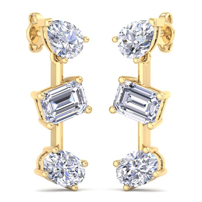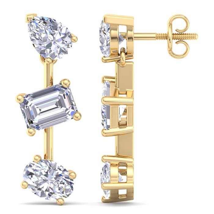 These lab grown diamond earrings feature 2 emerald cut, 2 oval shape and 2 pear shape lab grown diamonds in G-H color, VS clarity. Total carat weight is 5 carats. These earrings are in 14 karat yellow gold. These earrings dangle down 1 Inch and have post with friction backs.