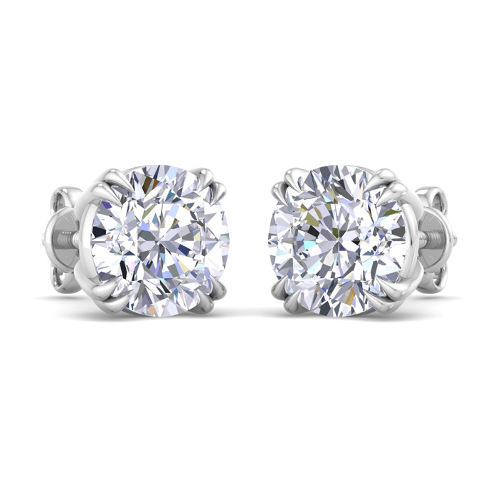 These lab grown diamond earrings feature two 2 1/2 carat lab grown diamonds in G-H color, VS clarity. Total carat weight is 5 carats. These earrings are in 14 karat white gold and are in a double prong setting with screwbacks.