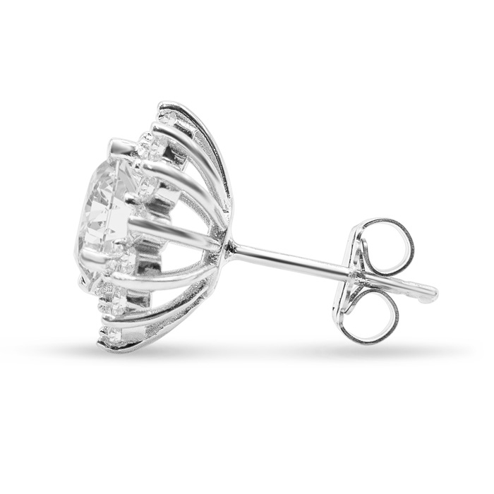 These lab grown diamond earrings feature two 2 carat center lab grown diamonds in G-H color, VS clarity. They are surrounded by 28 lab grown diamonds. Total carat weight is 5 carats. These earrings are in 14 karat white gold. These earrings have comfortable post with friction backs and measure just over 1/2 inch.