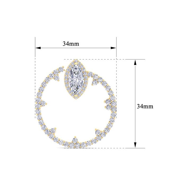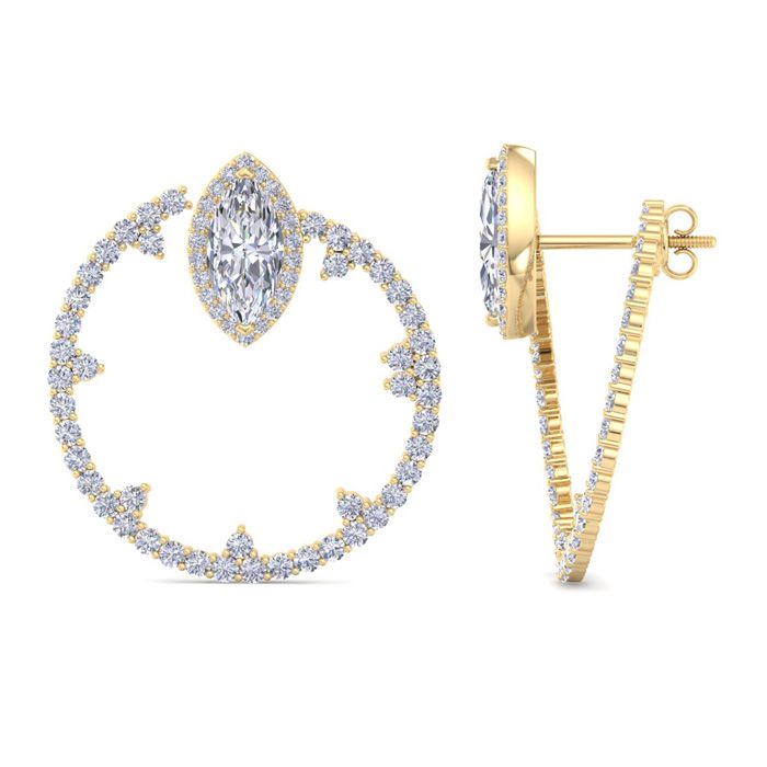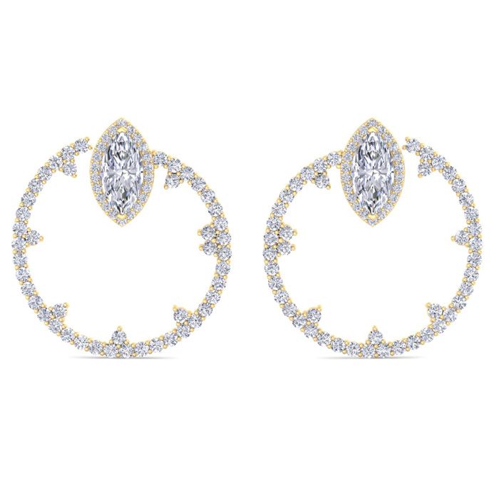 These lab grown diamond earrings feature 2 marquise shape and 136 round shape lab grown diamonds in G-H color, VS clarity. Total carat weight is 6 carats. These earrings are in 14 karat yellow gold. These earrings dangle down 1 1/3 inches and have click backs.