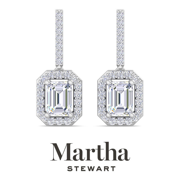 Showcasing class, style and timeless sophistication, the Martha Stewart fine jewelry collection is here to be celebrated. These Martha Stewart lab grown diamond earrings feature 50 round shape lab grown diamonds in G-H color, VS clarity and two 1 carat emerald cut lab grown diamonds. Total carat weight is 2 1/2 carats. These earrings are in 14 karat white gold and have post with screw backs. These earrings dangle down 1 inch! Whether worn for a special event or to enhance everyday elegance, these earrings are sure to become cherished heirlooms. Martha Stewart’s attention to detail and dedication to quality shine through in every piece, making this collection a celebration of refined craftsmanship and timeless beauty.
